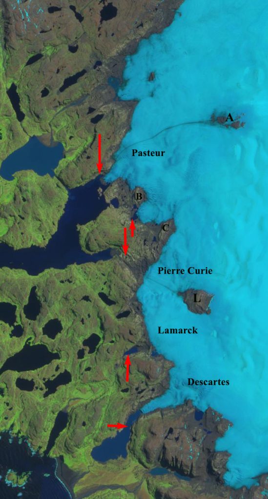 Dumon d”Urville Glacier has retreated 1.5 km with the lake it terminates in developing an expanding southern embayment.