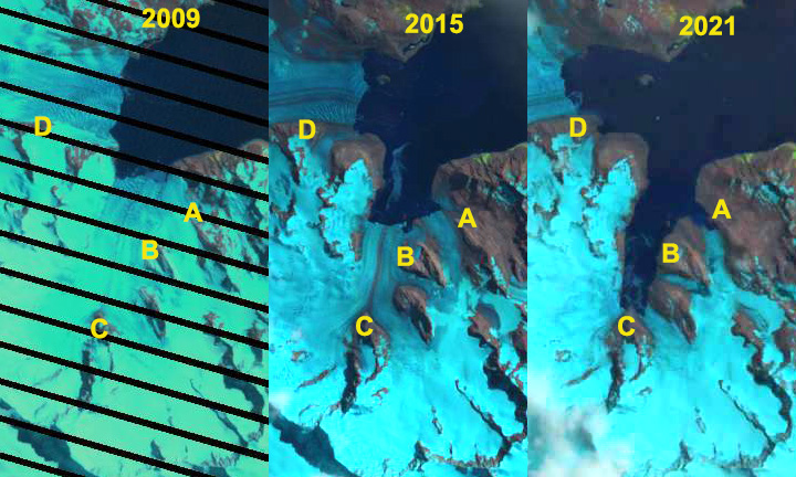 Retreat of Turnback Glacier (T) from the shore of Fortuna Bay (FB) and retreat of Compass and Crean Glacier (A,B,C) exposing new terrain along the shore of Antarctic Bay (AB) in Landsat images. Also note the expansion of bedrock nunatks at Point E-H.