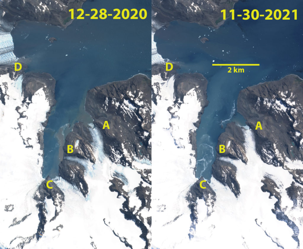 Retreat of Turnback Glacier (T) from the shore of Fortuna Bay (FB) and retreat of Compass and Crean Glacier (A,B,C) exposing new terrain along the shore of Antarctic Bay (AB) in false color Sentinel images. Also note the expansion of bedrock nunataks at Point E-H. Also the medial moraine transitioning to deglaciated ridge at Point J.
