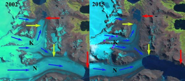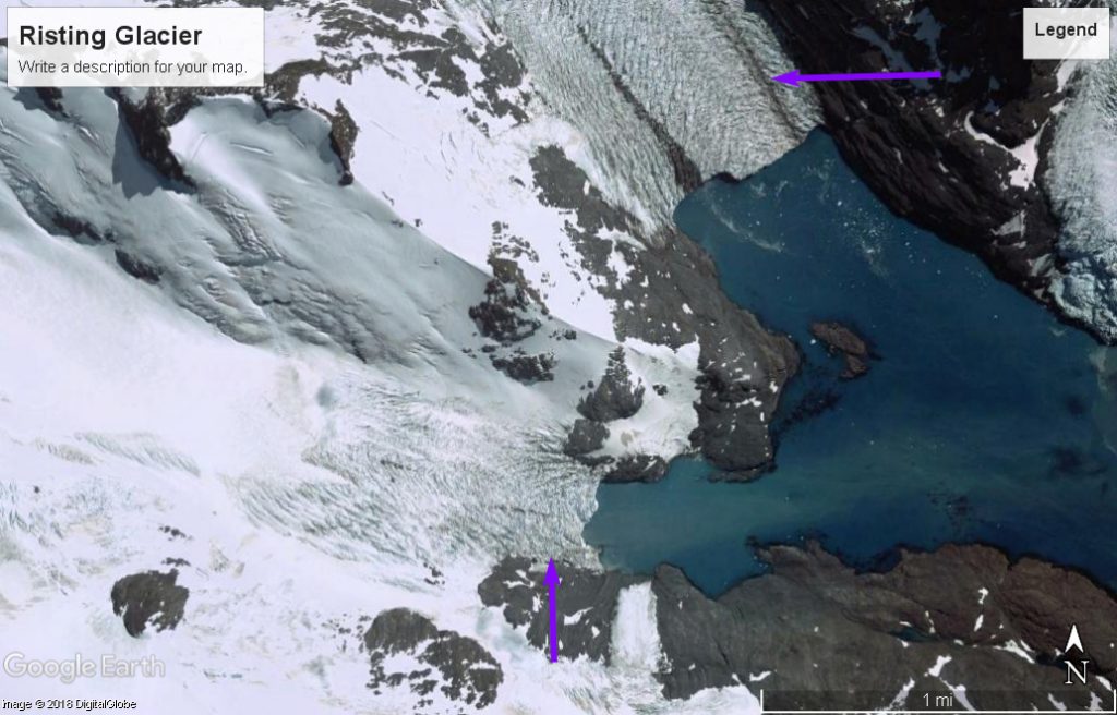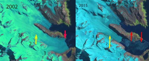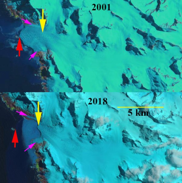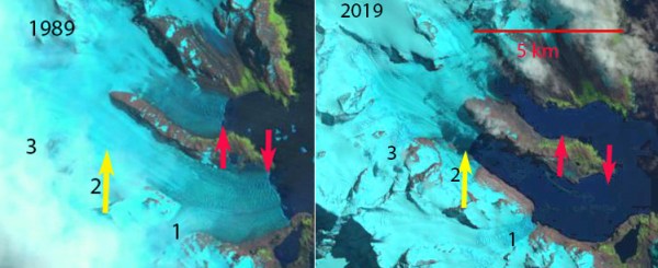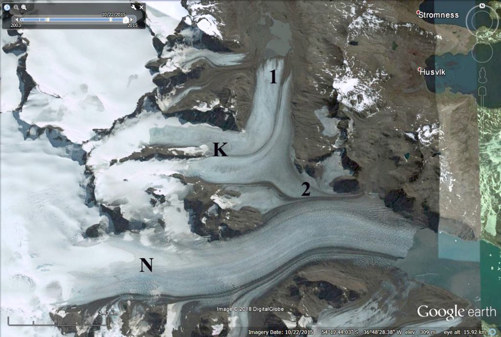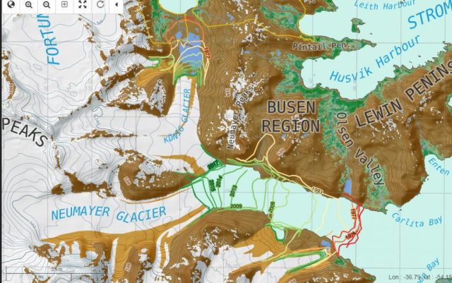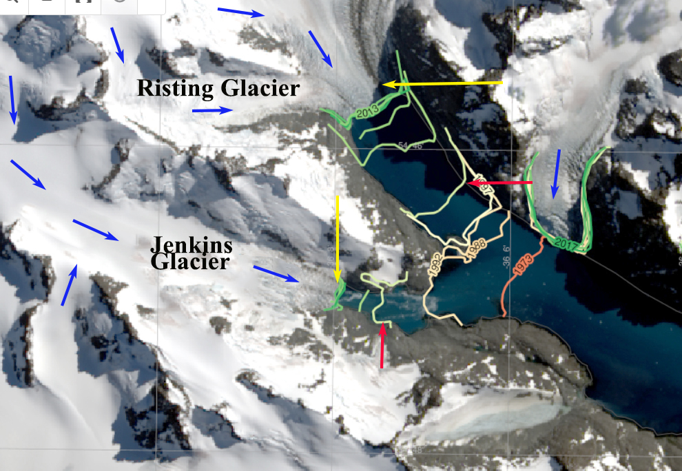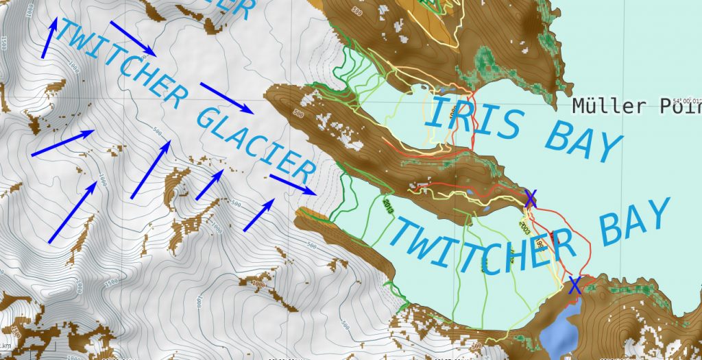The retreat here is signficicantly less than the larger glaciers Ross/Hindle, Neumayer, Konig and Twitcher Glacier, but is still exposing new coastal regions that are being occupied by flora and fauna.