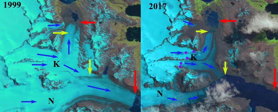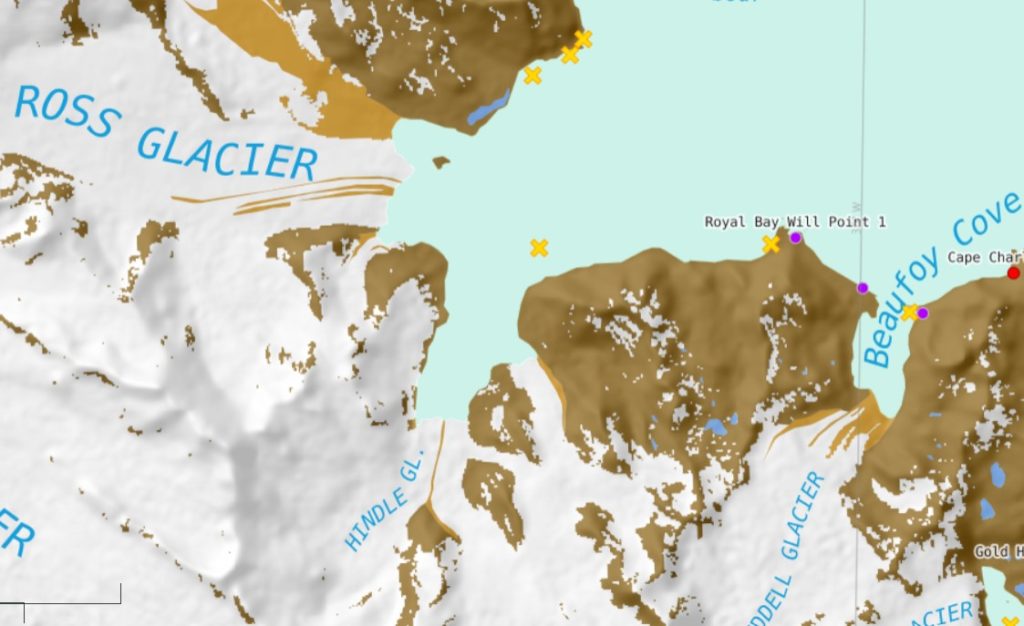 In 1999 Turnback Glacier (T) is within a 100 meters of the Fortuna Bay shore and has a single terminus with a medial moraine extending to the terminus near the glacier center. Crean and Compass Glacier have just retreated from two islands adjacent to Point B and C, and reaches the shore in a cove at Point A. By 2017 Turnback Glacier has retreated 500 m from the shoreline of Fortuna Bay and has begun to separate into two separate termini, with the medial moraine extending from Point J to the terminus still largely a medial moraine. An increasing area of deglaciated terrain extends from Point A-B along the shore where Crean Glacier is retreating. Compass Glacier has retreated 375 m from the island at Point C. By 2023 Turnback Glacier has retreated 650 m, and has separated into two termini separated by a deglaciated ridge extending from Point J to the terminus. Compass Glacier has retreated 450 m from the island at Point C. At Crean Glacier there is a 1 km² contiguous area of deglaciated terrrain along the shore that previously had been smaller separated segments. The glaciers begin on shared accumulation plateau with Fortuna Glacier at 500-600 m. This region is thinning as indicated by the increasing exposure of nunataks at Point E-H, which will drive ongoing retreat. The British Antarctic Survey map below illustrates glacier retreat and the elephant seal beaches (yellow X) and penguin colonies (purple dots) in the two bays.