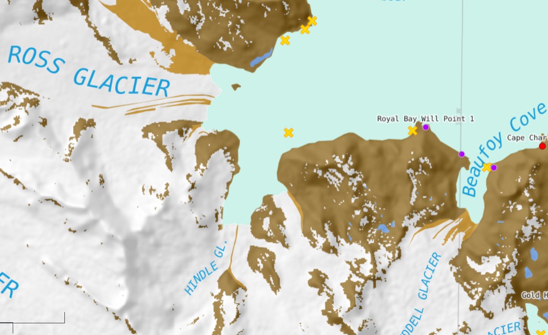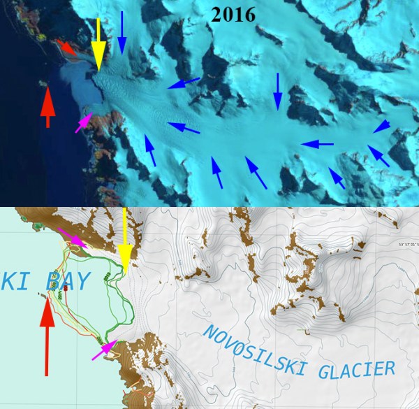 British Antarctic Survey map of the Fortuna Bay to Antarctic Bay shoreline and glaciers. Colored lines indicate glacier retreat, yellow X=elephant seal beaches, purple dots=penguin colonies.