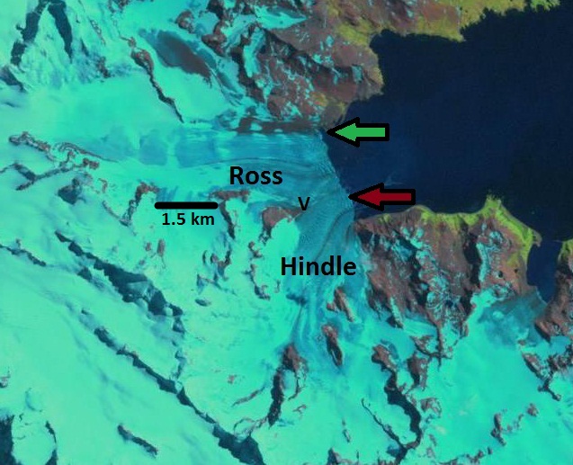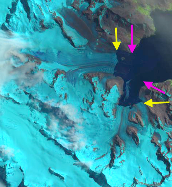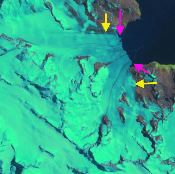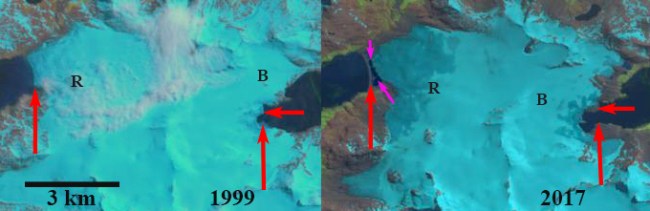 Ryan (R) and Brunonia Glacier (B) in 1999 and 2016 Landsat images. Red arrows indicate the 1999 terminus and pink arrows a new proglacial lake.