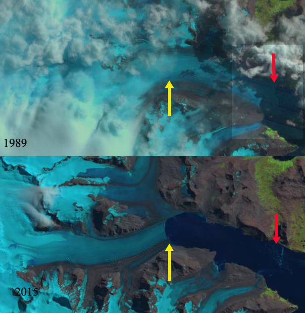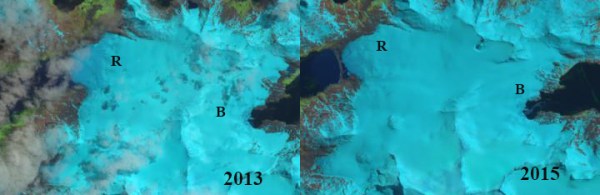 Ryan and Brunonia Glacier in 2013 and 2015 Landsat images. The 2015 image indicates Ryan Glacier is no longer tidewater.