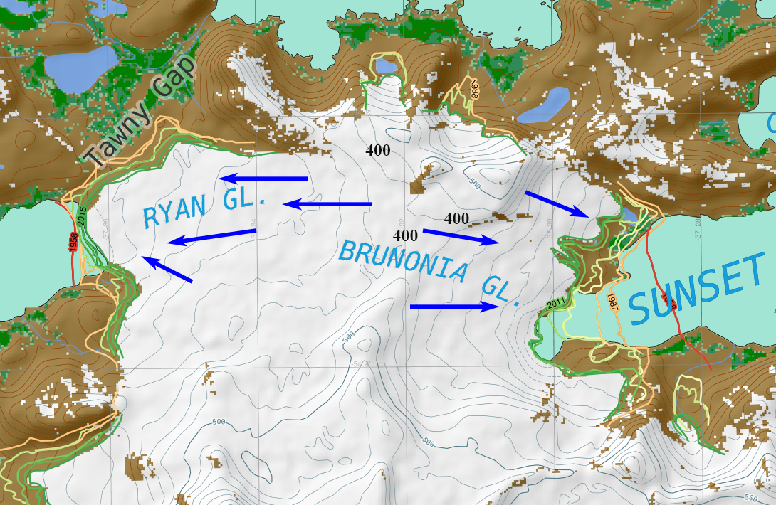 In 1999 Ryan Glacier reaches tidewater across a 1.2 km glacier front. Brunonia Glacier terminates in Sunset Fjord pinned on what is a bedrock prominence under the ice. In 2013 and 2015 Landsat imagery from early in the melt season indicates the melt zone is below 200 m. In 2015 it is evident that Ryan Glacier no longer reaches tidewater. In 2016 Ryan Glacier is separated from Ice Fjord by a barrier beach and a narrow developing proglacial lake, pink arrow. The glacier has retreated 200 m since 1999. Brunonia Glacier has experienced a 400 m retreat exposing 2 new peninsulas. The first is on the north side of the fjord and the other is mid glacier. Both had been under the ice in 1999. The snowline in 2016 on Ryan Glacier is also higher reaching 250 m in mid-February. Retreat of Ryan Glacier from 1958 to 1999 was 100 m, while the retreat on Brunonia in the same period was 700-800 m.