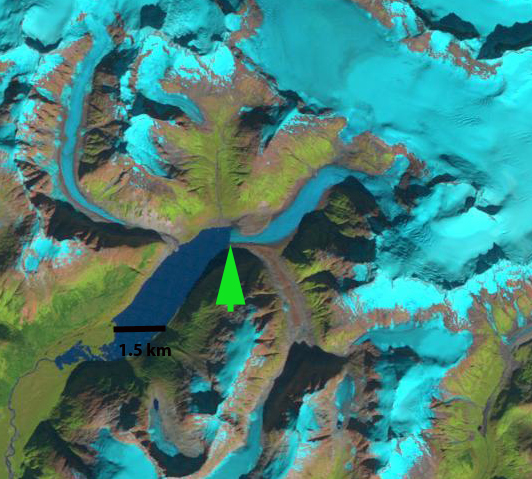 Yalik Glacier drains an icefield on the Kenai Peninsula, glaciers draining east are in the Kenai Fjords National Park, which has a monitoring program. From 1950-2005 all 27 glaciers in the Kenai Icefield region examined retreated (Giffen et al 2014). Yalik Glacier retreated 1057 m from 1950-1986, a rate of-29 m/year and 797 m from 1986-2000, a rate of 57 m/year (Giffen et al 2014). Here we update the retreat using Landsat images from 1986, 2000, 2018 and 2019.