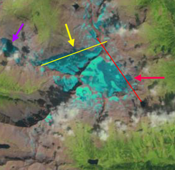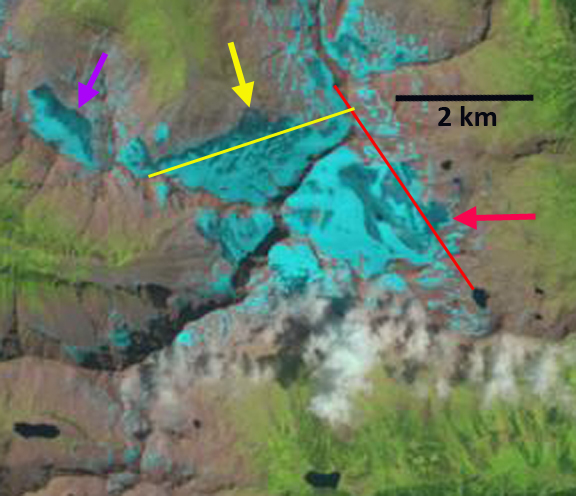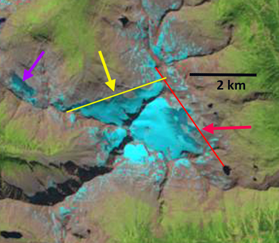 Here we examine the Hochalm Glacier and two neighboring glaciers and their response to climate change from 1990 to 2013 using Landsat imagery. The red line in each Landsat image is in the same location cutting across the Hochalm Glacier. The yellow line is in the same location transecting the Grosselend Glacier. In 1990 Hochalm Glacier has two termini tongues and has a width of 1.1 km extending past the red line. On Grosselend Glacier the terminus area extends beyond the yellow across the entire width of the glacier. The purple arrow indicates a small pocket glacier that has an area of approximately 0.45 square kilometers. In 2000 the Hochalm Glacier has just two narrow termi extending past the red line. The Grosselend Glacier still extends beyond the yellow line. In 2013 the southern terminus of Hochalm Glacier has disintegrated and only the northern terminus reaches the red line. On Grosselend Glacier approximately 40% of the glacier width reaches the yellow line, the main terminus tongue at the yellow arrow has retreated to the yellow line. The area of the glacier at the purple arrow is now 0.23 square kilometers, half of its 1990 extent.