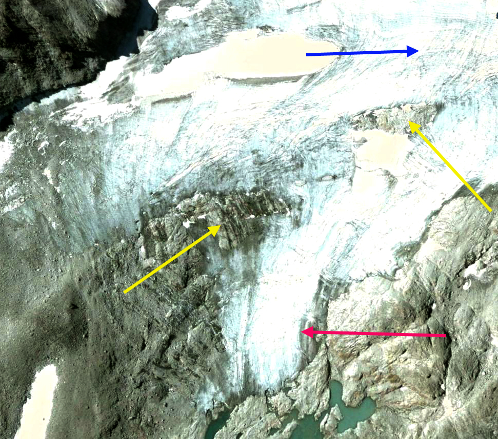 A 2006 Google Earth image of the Hochalm Glacier’s southern terminus indicates how thin it is with no crevassing, red arrow, and several large bedrock areas amidst the glacier, purple arrow. There are numerous annual horizons exposed just below the snowline as well, blue line. The retreat of Hochalm Glacier from 1990-2013 is 200 m for the northern terminus and 450 m for the southern terminus. For Grosselend Glacier the retreat of the main terminus is 450-500 m since 1990. The retreat follows that of Austrian glaciers as a whole as noted by Fisher et al (2014), and Abermann et al (2009). The glacier is thinning even in its upper regions, which indicates it cannot survive (Pelto, 2010). The retreat of Ochsentaler, Sulztalferner and Obersublzbach Glacier indicate a similar story.