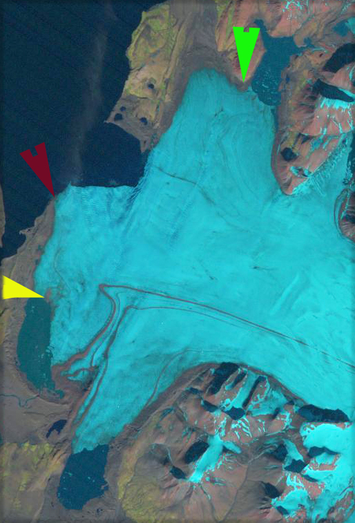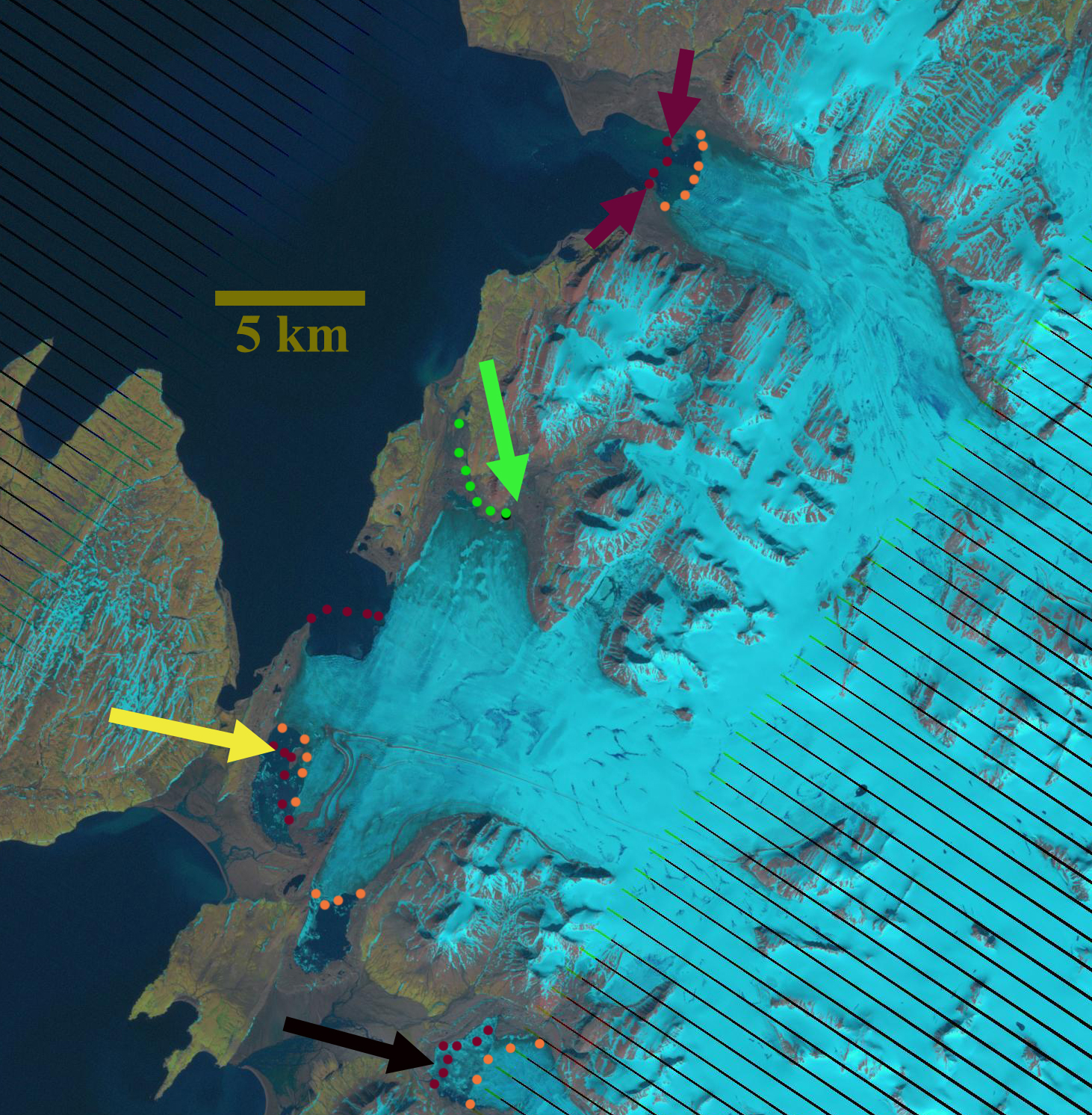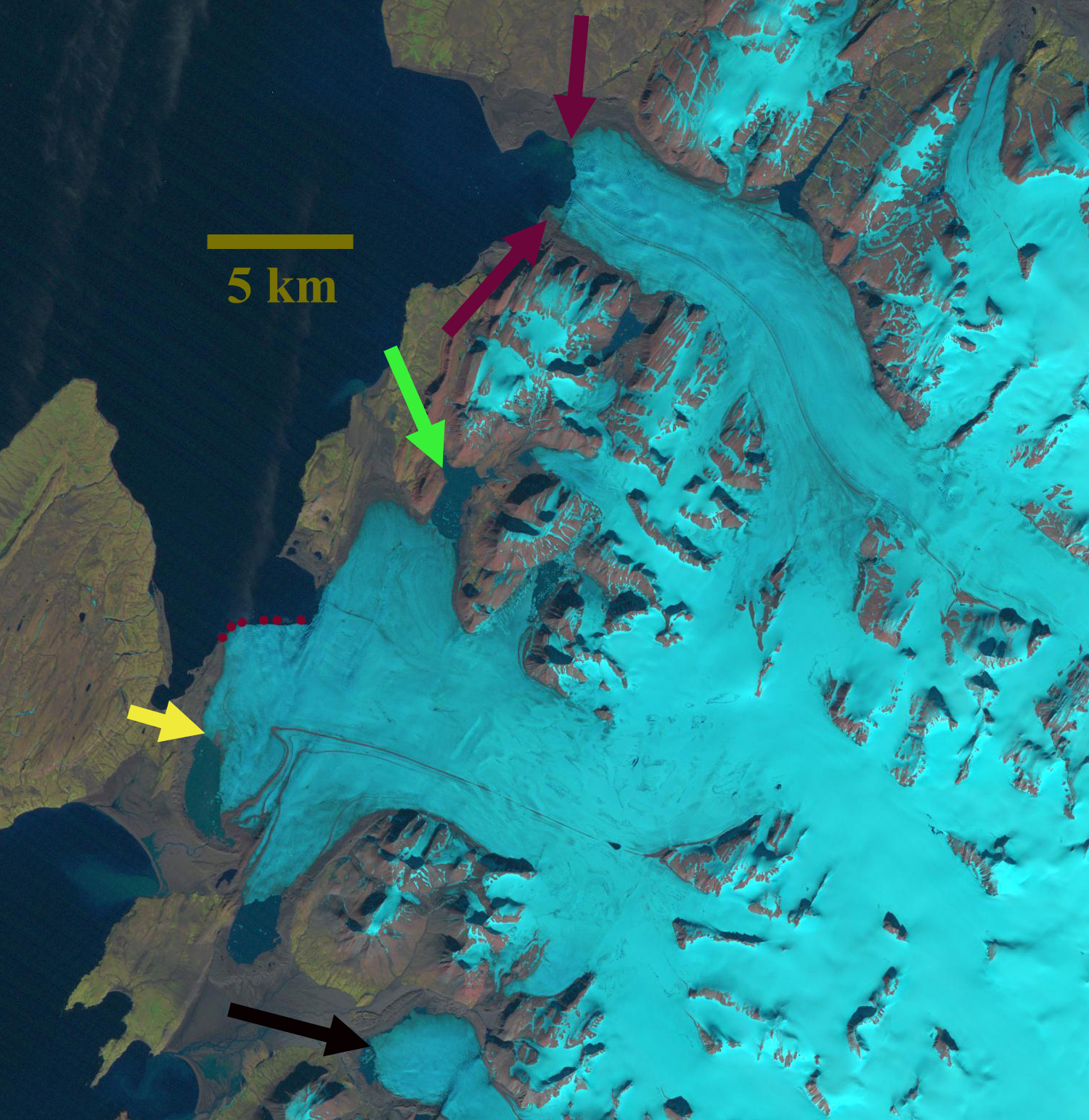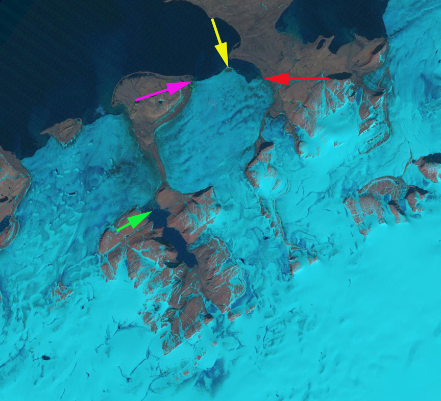 Nizkiy Glacier in 1990 and 2016 Landsat images. red arrows indicate locations of the 1990 terminus and yellow arrows the 2016 terminus. Purple arrow indicates an expanding bedrock rib amidst the glacier and purple dots indicate the snowline.