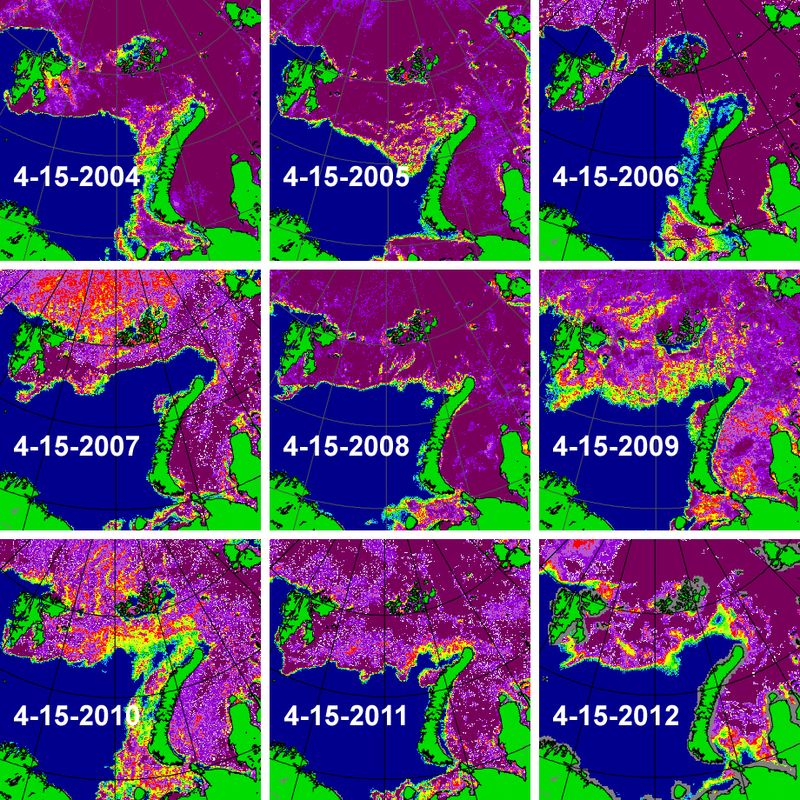 The Nizkiy Glacier has several termini in lakes and one in the Barents Sea. The main terminus juts north out to the end of a peninsula in 1990, with an embayment developing from the peninsula across to the northern edge of the terminus. The middle terminus ends in a proglacial lake and in 1990 the terminus largely envelops an island in the lake. The southernmost terminus is in a proglacial lake shown is indicated by a red arrow as well. The 2016 Landsat image indicates the continued reduction in Nizkiy Glacier width reaching the peninsula at the yellow arrow, having retreated 1200 m from the 1990 position. Hence, It will likely be quite soon when the proglacial lake with the island joins with the Barents Sea. The northern edge of the terminus has retreated little, but the size of the embayment between the northern edge and the peninsula has doubled since 1990. A new island has been exposed in the proglacial lake between the main terminus and the peninsula. The expansion of the proglacial lake on the north side of the glacier just inland of the main terminus has retreated 600 m. The southernmost terminus has retreated 1100 m in an expanding proglacial lake. The purple arrow in the comparison image indicates an expanding rib of bedrock amidst the glacier. In 1990 the snowline is at 550 m. In 2015 the snowline is at 450 m. In July of 2016 the snowline is at 525 and in September is at 600 m. This glacier fits the pattern of other Novaya Zemlya glaciers (Pelto, 2016), such as Krayniy and Tasija. The lack of sea ice off the west coast of Novaya Zemlya in April of 2017, seen below, is a continuation of the pattern of open water early in the melt season, enhancing frontal melt. Note the pattern of sea ice in mid-April of 2004-2012 below