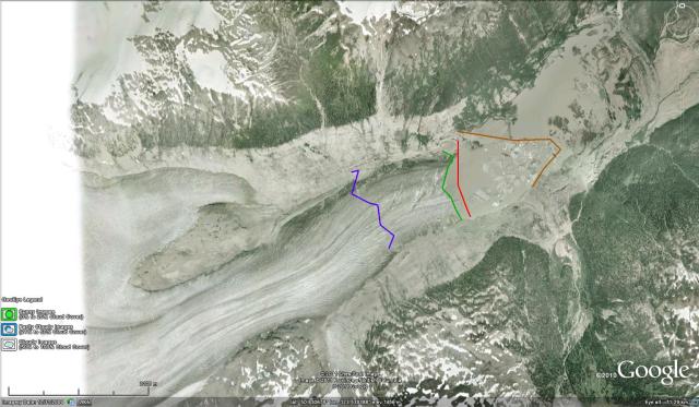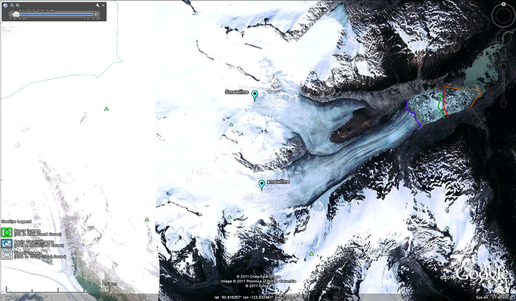 . The glacier terminus in 1970 is shown in map form, and is indicated by a brown line. The 2003 terminus position from a Landsat image, second image, is next with a red line marking the terminus. The normal Google Earth image, third image, is from 2005 and has a green line. An image from Geoeye from August 2010, last image, terminus purple line indicates the rapid acceleration of retreat. Retreat from 1970-2003 was 48 m per year. The retreat from 2003 to 2010 is 1400 meters, 200 m per year.