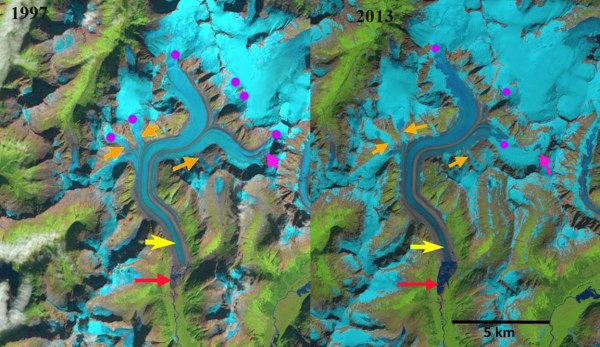Bridge Glacier in Landsat images from 1997 and 2013. The red arrow indicates the 1984 terminus , yellow arrow is 2017 terminus, orange arrows are selected tributaries and purple dots the snowline.