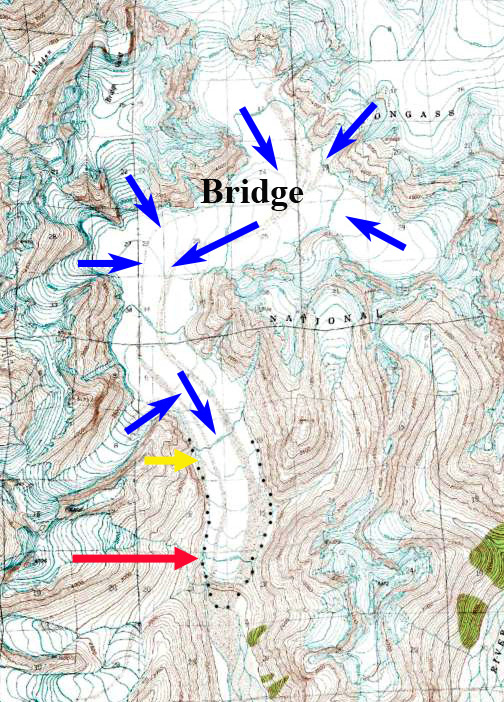 In 1984 the glacier ended on an outwash plain at the head of a branch of Speel River. The red arrow indicates the 1984 terminus for each image, the yellow arrow the 2017 terminus and the orange arrows three tributaries feeding the glacier. The purple dots indicate the snowline at 1200 m. In 1984 all three tributary glaciers fed Bridge Glacier and the glacier has no proglacial lake at the terminus. In 1997 a lake basin is beginning to develop, though it is still largely filled by ice. The eastern tributary pink arrow, has lost all of its snowpack. The three tributaries at the orange arrows are connected to Bridge Glacier still and the snowline is at 1250 m. In 1999 the proglacial lake has formed and has length of 1 km, the lake has expanded south and north of the 1984 terminus position, and does not entirely represent glacier retreat. In 2013 the glacier has retreated 1200 m from the 1984 position and the lake is still expanding. The orange arrows indicate that none of the three tributaries are still connected to the main glacier. The glacier in a sense is losing its income flow from these subsidiaries. The eastern tributary has retained some snowcover with six weeks left in the melt season in 2013, but this is mostly gone a month later, the snowline is at 1100 m. nbsp; Total retreat from 1984 to 2017 is 1900 m. In 2017 the snowline is at 1300 m, and the separation of the tributaries is by more than 500 m in each case. The snowline has been high by the end of each summer from 2014-2017 indicating retreat will continue. The retreat of this glacier is the same story as seen at nearby Patterson, Gilkey and Norris Glacier.