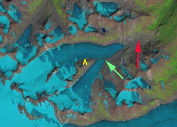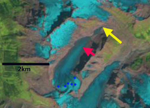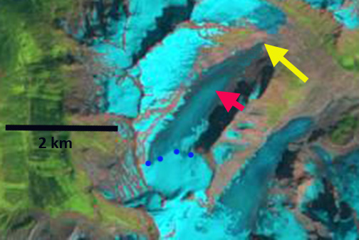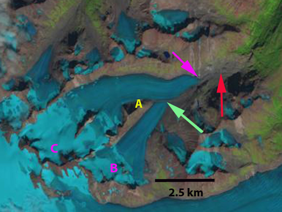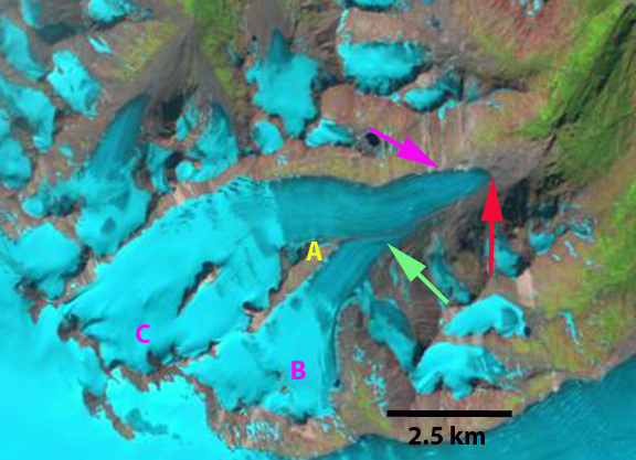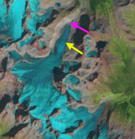 Comparison of the Cummins Glacier from 1986 to 2015. Purple arrows indicate upglacier thinning and disconnection. Red arrow indicates 1986 terminus position. Note the lack of snowcover in 2015.