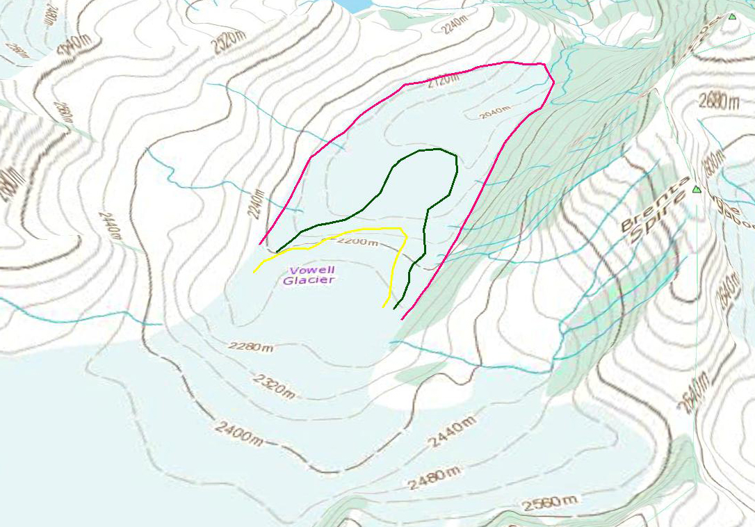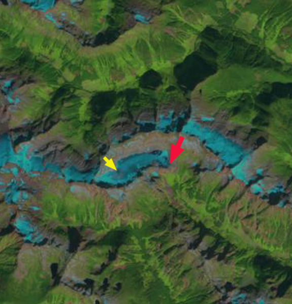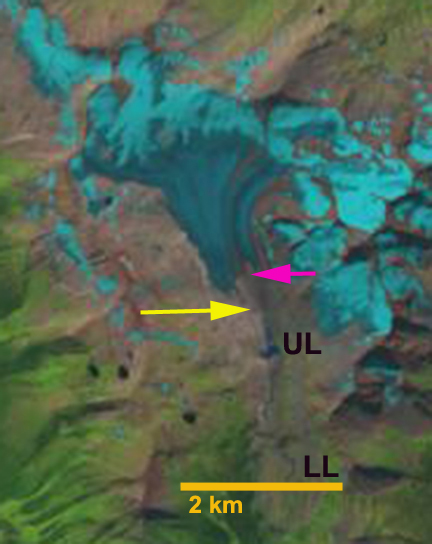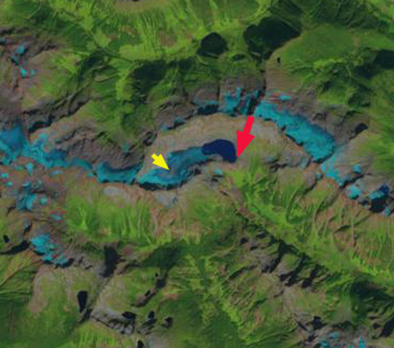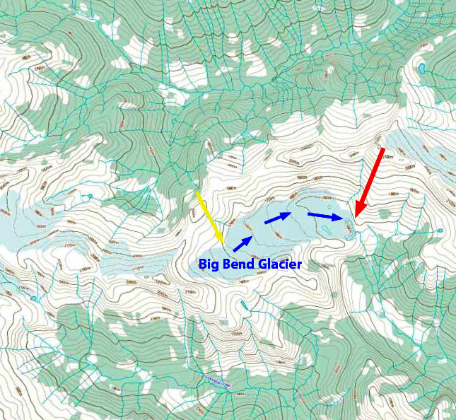 In 1986 Cummins Glacier had a joint terminus with the main southeast flowing branch and the west flowing branch terminating at the red arrow. The glacier also had a substantial connection, purple arrow, with Tusk Glacier that flows east terminating northeast of Tusk Peak. There are other connections with other high elevation accumulation areas, purple arrows. In 2013 and 2014 Cummins Glacier had less than 20% retained snowcover by the end of the melt season. Typically 50-65% of a glacier must be snowcovered at the end of the summer season to be in equilibrium. In 2015 conditions were even worse with no retained snowcover, in fact there is only minor patches of retained firn from previous years. The lack of a persistent accumulation zone indicates a glacier that cannot survive the climate conditions (Pelto, 2010). By 2015 a proglacial lake had formed at the terminus that is 500 m long, representing the retreat during the thirty year period. The west flowing portion of the Cummins has detached from the larger branch. The connection to Tusk Glacier is nearly severed, and in terms of flow is effectively ended. Retreat of the margin higher on the glacier is also evident at each purple arrow. Tusk Glacier is no longer connected to Duplicate Glacier, and has retreated to the north side of Tusk Peak. The dominant change in Cummins Glacier has been thinning, it should now be poised for a more rapid retreat.