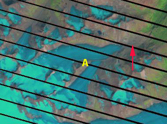 Landsat image 2014 about 25% retained snowcover with three week left in the melt season.
