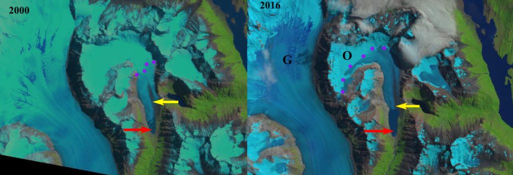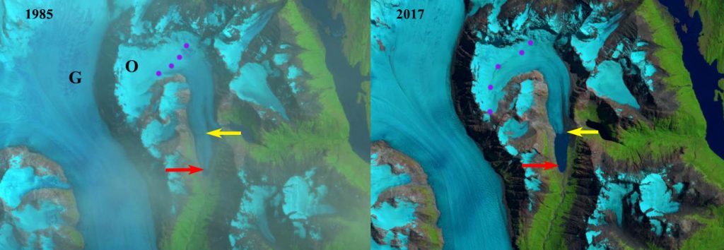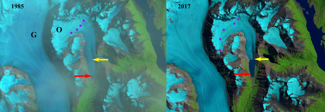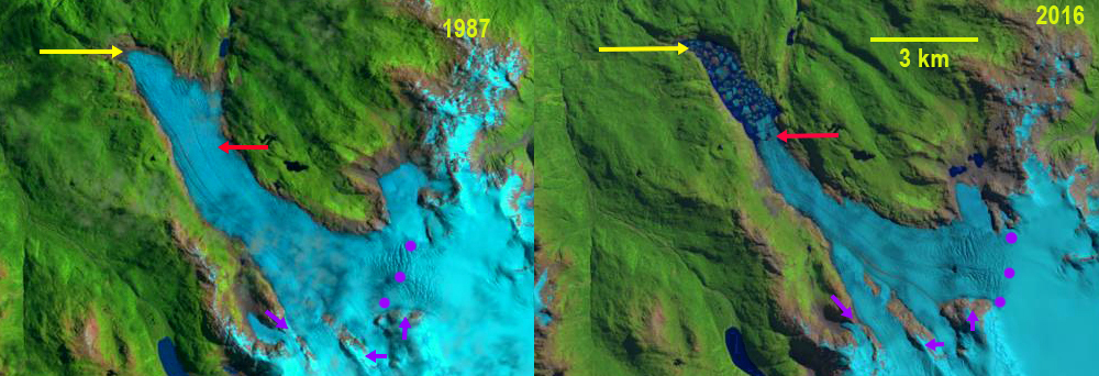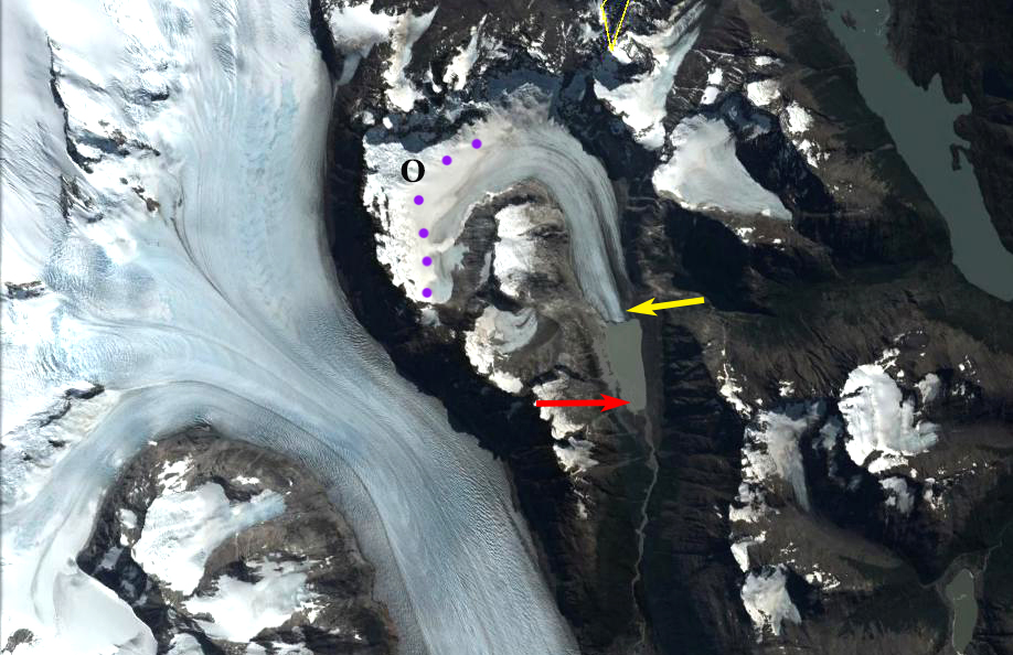 Cortaderal Glacier in Sentinel image with no retained snowcover this summer, and bedrock expansion at Point A.