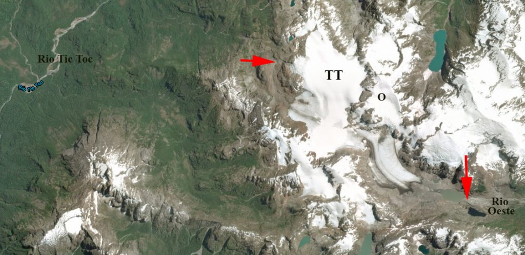 Olivares Beta and Gamma Glacier in Sentinel image with no retained snowcover this summer, retreating away from proglacial lakes and bedrock expansion at Point A.