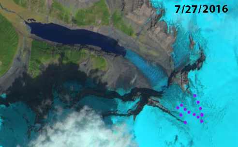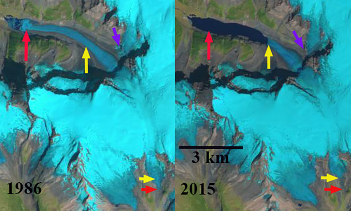 Lower Curtis Glacier indicating recession since 1985. The glacier has thinned considerably in the lower section since the 2003 image below.