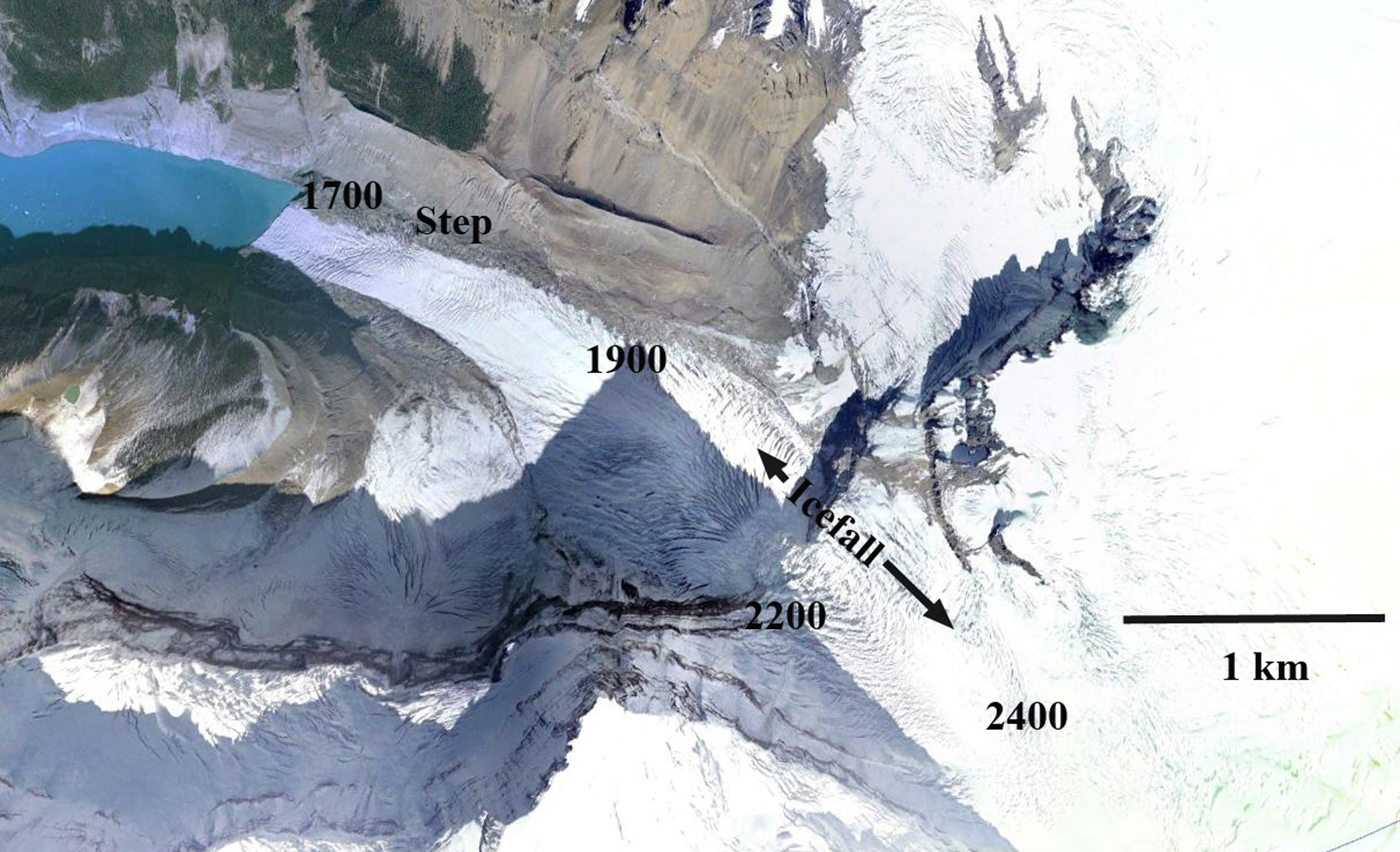 We have observed crevasse depths for a decade and have seen both their number and depth decline in icefalls on Easton and Lower Curtis Glacier due to glacier thinning and reduced velocity. Deepest crevasses are at the top of the convex slope change, 25-30 m deep.