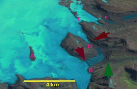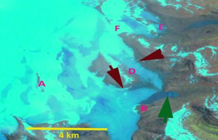 Dumon d”Urville Glacier has retreated 1.5 km with the lake it terminates in developing an expanding southern embayment.