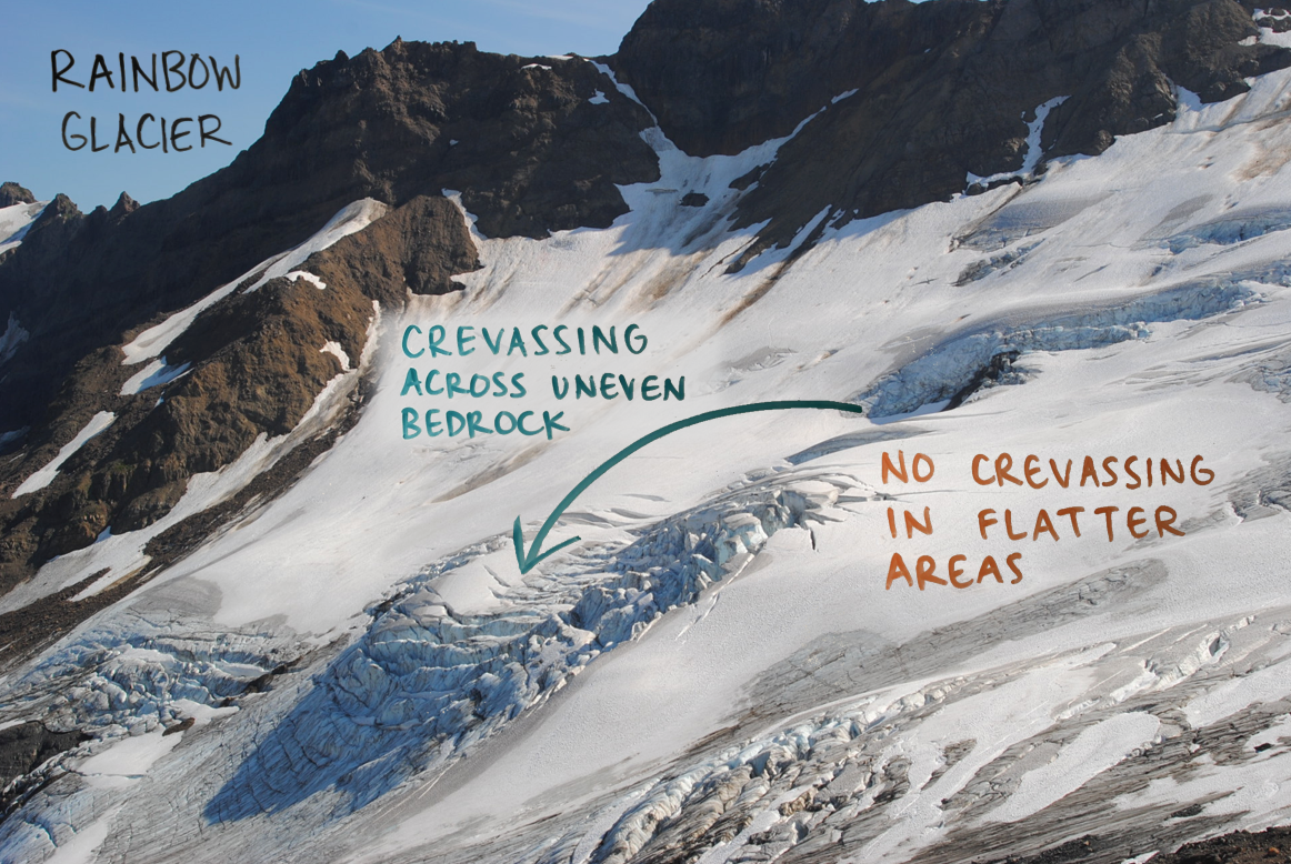 Glaciers are the same way, and so another driver for crevasse formation is ice flow speed up in these areas. Other factors that could be at play are roughness of the underlying bed or drag along valley walls. The above photo of Rainbow Glacier shows a complex surface of crevassed and smooth areas, which hints to a similarly complex underlying bed.