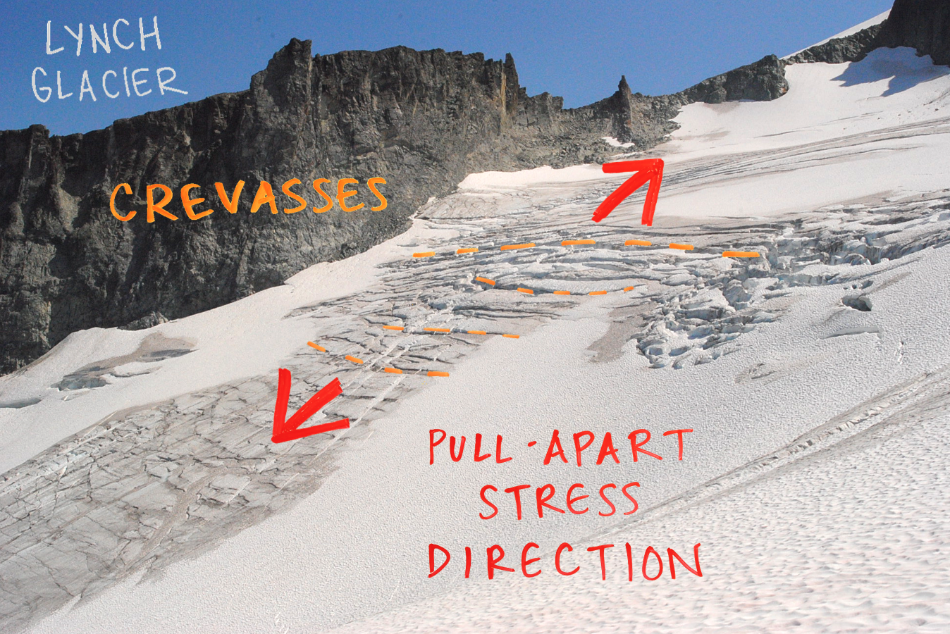 Other information we can gather from crevasses is related to the internal stresses in the ice. Crevasses are opened by pull-apart forces which act perpendicular to the trend of the crevasse.