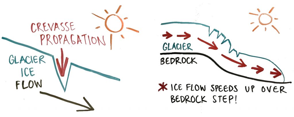 In mountain glacier systems, crevassing is likely to occur as ice flows over bedrock “steps.” Imagine you are baking a pie, and it is time to mold your pie crust to the pan. You must be very careful when bending the dough around the pie pan, because it may crack if you fold it too much or too suddenly.
