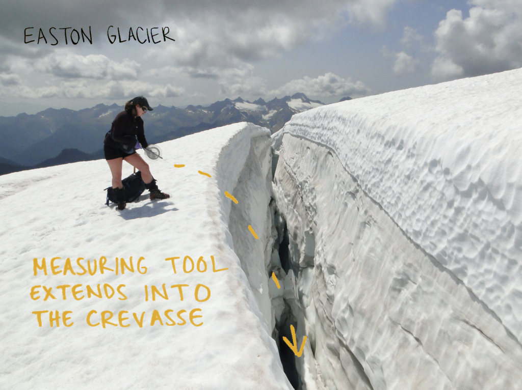 During the 2019 field season of the North Cascades Glacier Climate Project, we measured these crevasses in a few different ways. Seven field seasons ago, Jill Pelto began collecting data on crevasse depth. She uses a cam line, which is essentially a weighted tape measure, to determine total crevasse depth on each glacier. This photo shows Jill measuring a crevasse on Easton Glacier. She tries to analyze crevasses in similar regions of the glaciers from year to year to achieve a cohesive dataset which could be useful on a long-time scale. This data has the potential to shed light on important glacial changes and how they may relate to regional warming or shifts in precipitation patterns in the North Cascades. The data could also illuminate differences in the behavior of each individual glacier. Overall the number of crevasses has declined, in 2019 average depth on Easton Glacier was 10-15 m.