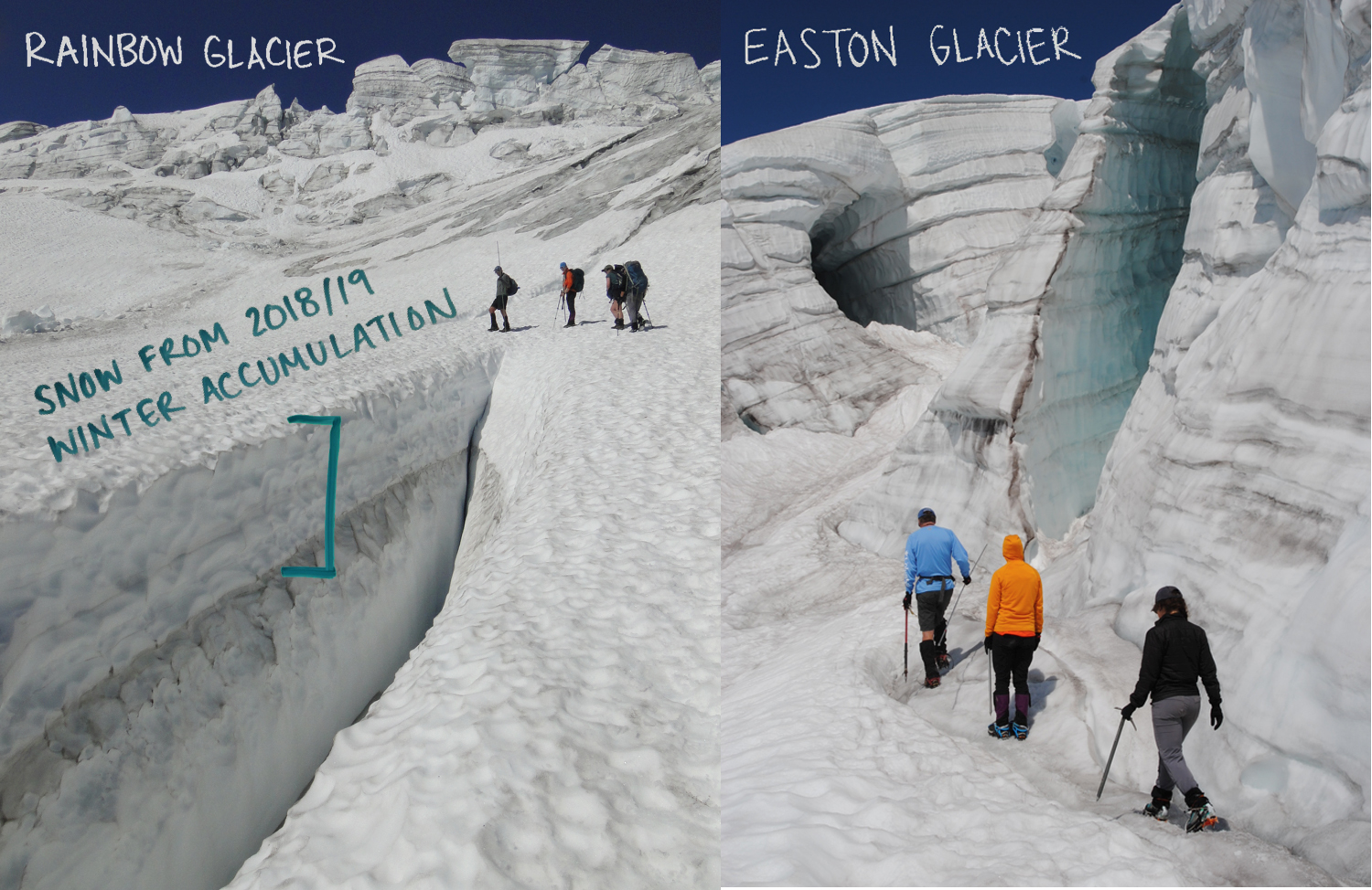 The North Cascades Glacier Climate Project has observed glacial thinning due to lower rates of snowfall paired with more intense summer melt seasons over the past 36 years. This has led to a reduction in the number of crevasses in many areas. During summer 2019, the glaciers we visited in the North Cascades will lose up to 2 meters of snow from their surfaces to melting. It is likely that as this pattern continues, there will be even less surface crevassing on the glaciers.