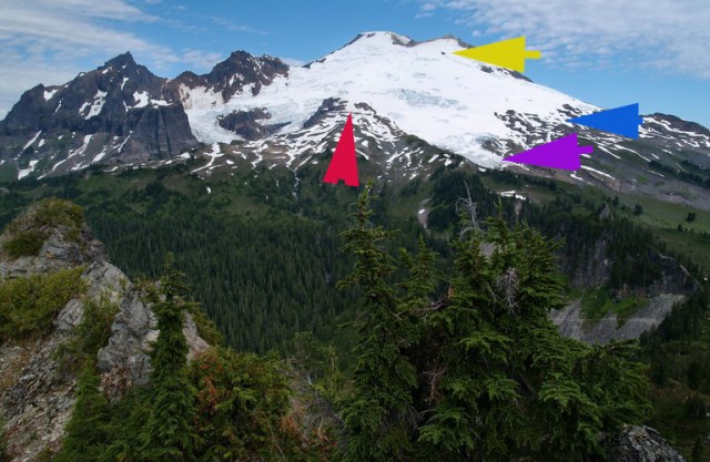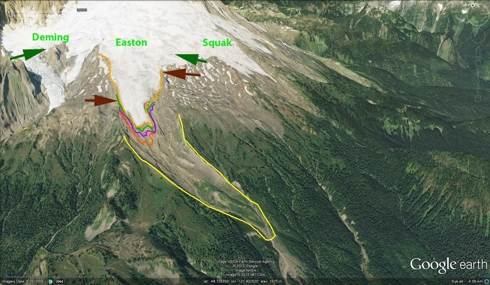 Columbia Glacier occupies a deep cirque above Blanca Lake ranging in altitude from 1400 meters to 1700 meters. Kyes, Monte Cristo and Columbia Peak surround the glacier with summits 700 meters above the glacier. The glacier is the beneficiary of heavy orographic lifting over the surrounding peaks, and heavy avalanching off the same peaks. Standing on the glacier is a bit like being in the bottom of a bath tub, with avalanche slopes extending up both sides, predominantly on the west side. The last half of January 2021 was a dry period in the region, with an extensive crust forming on the snowpack. This was followed by 106 inches of dry snowfall from Feb. 4 to Feb. 20,and then 34 inches of wet snowfall and even rain through Feb. 24 This generated extreme avalanche danger and numerous climax avalanches in the Stevens Pass region.