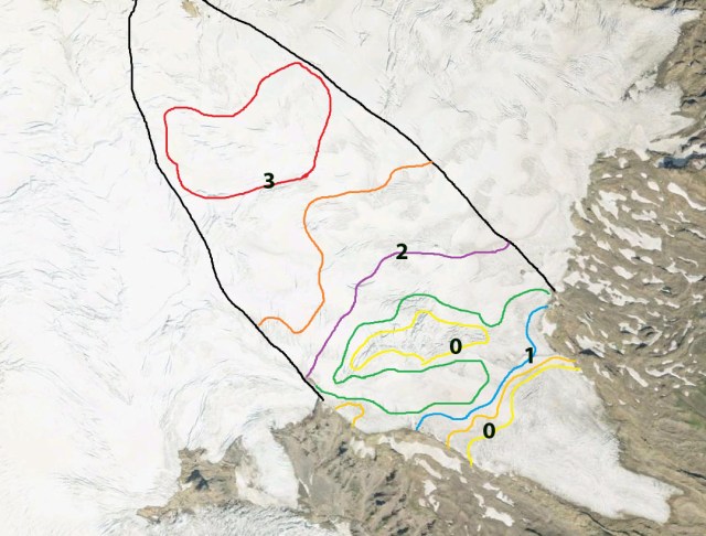 On Aug. 11, 2021, the glacier had only 38% snowcover, with more than 50% of the area above 2500 m having lost all winter 2021 snowcover. By summer’s end the glacier will certainly have the lowest percentage of snowcover of any year since we began monitoring in 1990. The bench at 2000 m typically has 2.75 m of snowpack on Aug. 10, and this year was 50% bare, with an average depth of 0.25 m. The icefall above also lacked snowcover as well. There are a number of pockets/basins, where wind deposition increased snow depth and this snowpack will be retained.