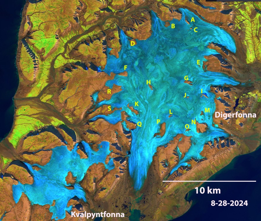 TopoSvalbard map and August 2020 Landsat image of the ice caps. This is after a recent small snow event and some drifted snow is evident, though 95% of the ice caps are snow free.