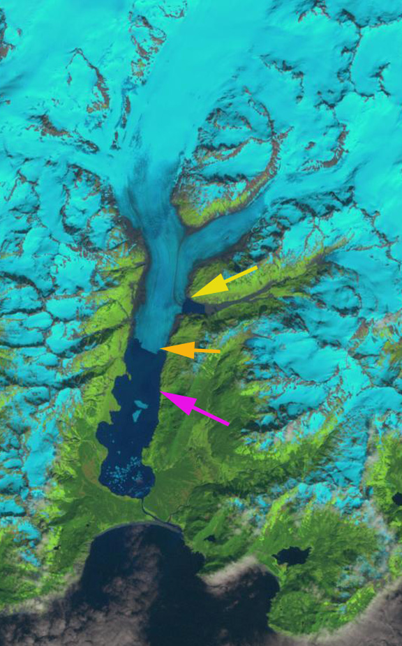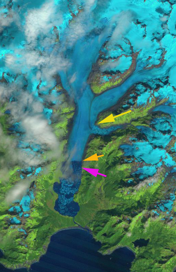 In 2016 the snowline is at 975 m, the lake has now extended 3 km along the western edge. The terminus is just east of a former tributary glacier, red arrow. The number of icebergs in 2016 indicates that significant ice calved during that year. The retreat of the eastern margin has been 500 m, with a 3.4 km retreat on the west margin. The main tongue in the lower two kilometers is 800 m wide versus 1200 m wide in 1989. In 2018 the snowline is at 1100 m, the terminus remains just west of a former tributary glacier. There is a rift forming near the pink arrow, where an iceberg will eventually detach (A). In late June of 2019 the rift has further developed, but the iceberg to be (A) has not detached. By mid-August of 2019 the rift has nearly led to detachment of an iceberg (A), the snowline is at 1075 m. In June of 2020 the iceberg has detached and there is a considerable melange of ice between the iceberg (A) and the main terminus. By Sept. 11, 2020 the iceberg remains in much the same position.