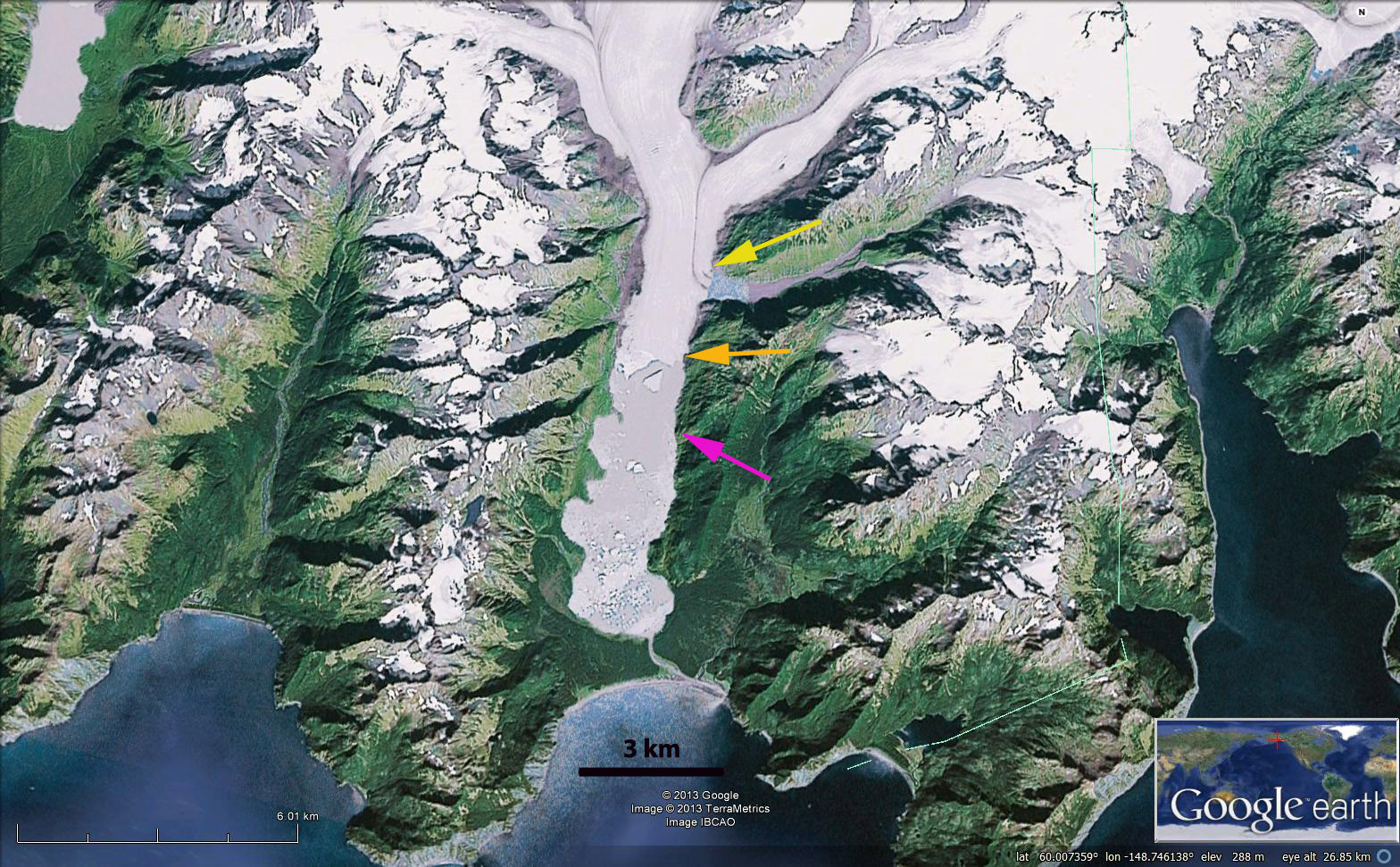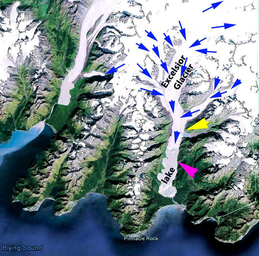 The glacier has retreated 2.4 km since 2018, and now terminates at yellow arrow 1 km downglacier of the junction of the two main tributaries. The iceberg has maintained an area of ~1 km2. The snowline in 2020 is at 1125 m indicating another of mass balance loss for the glacier. The lake is now 7 km long and the lake area is ~7.5 km2 up from 5 km2 in 2016. The retreat of this glacier paralells that of its neighbor Excelsior Glacier that retreated 4.7 km from 1994-2018. This continues to be a developing lake district including Grewingk Glacier.