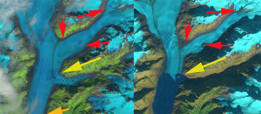 Ellsworth Glacier is a valley glacier draining south from Sargent Icefield on the Kenai Peninsula in Alaska. Along with the Excelsior Glacier it has been the longest glacier of the icefield. The glacier retreated into an expanding proglacial lake in the early 20th century (USGS-Molnia, 2008). The terminus in 2000 was reported to be 3.5 to 4.5 km from the 1908 position (USGS-Molnia, 2008). In a previous post we examined Landsat images from 1989-2016 to identify the changes including a 500 m retreat on the east margin of the lake and a 3400 m retreat on the west margin. It as noted that “this rapid lake expansion indicates that the lower 3 km of the glacier occupies a basin that will become a lake and that the tongue is partially afloat and given the narrowing thinning tongue is poised for collapse”. Here we document that collapse with Landsat images from 2016-2020.