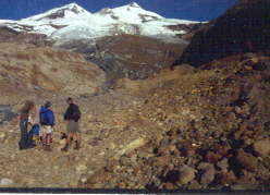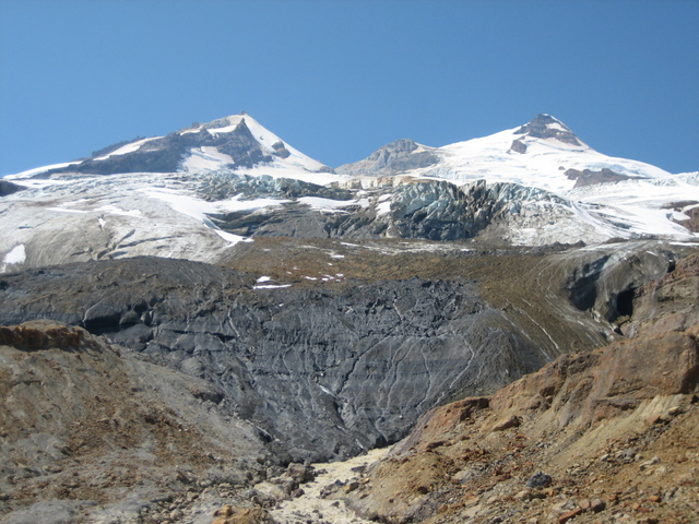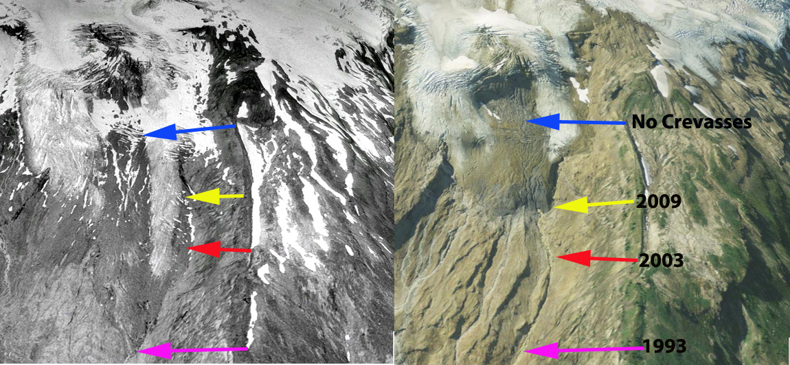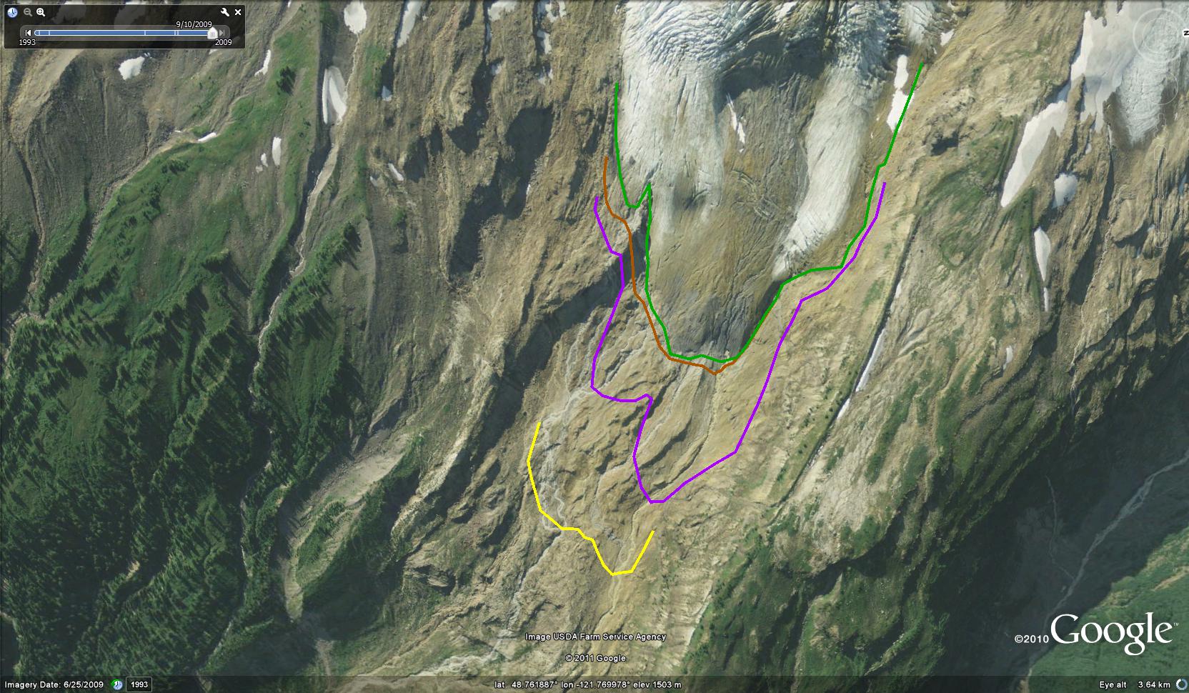 Several of the tributaries no longer join the Zemu, depriving it of a portion of a portion of its former accumulation sources. Near the head of the glacier the walls of Kanchenjunga delivers the debris and large amounts of snow in the form of avalanches to the glacier basin at 5900 to 5200 m. The lower 18 km of the glacier is in the ablation zone where melt dominates. A comparison of 2000 and 2013 Landsat images indicates the lack of change in location of main terminus, red arrows, but recession of surrounding glaciers in the Zemu Basin, yellow arrows.
