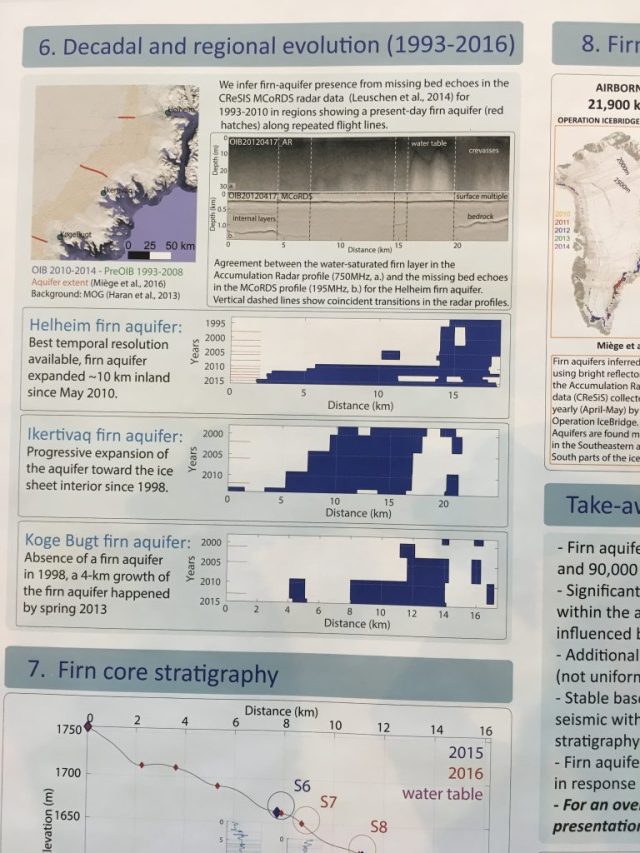 Richard Forster, U of Utah team presented work on the firn aquifer in Greenland. A feature we did not even know existed until 2011. They have conducted four field seasons, using ground penetrating radar and magnetic resonance soundings to map water table elevation, thickness and volume in several areas. They found the aquifer thickness has a typical thickness of 10-30 m. Further they found that firn aquifers have existed since at least 1993 and have expanded and shifted with time see above image.