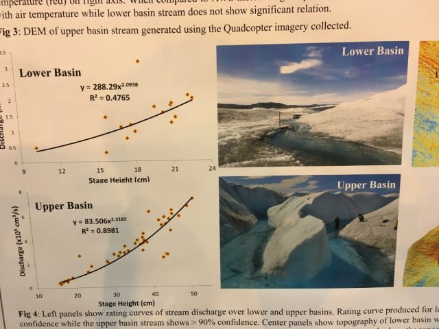 Rohi Muthyala, Rutgers University team measured the discharge of supraglacial streams for three months, constructing rating curves. They compared air temperature and discharge in the upper and lower basin. The upper basin was more related to the daily air temperature. The stream system feeds into a moulin system.