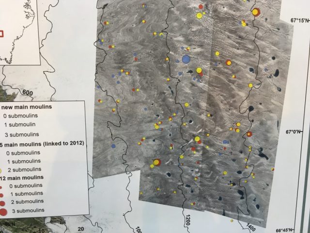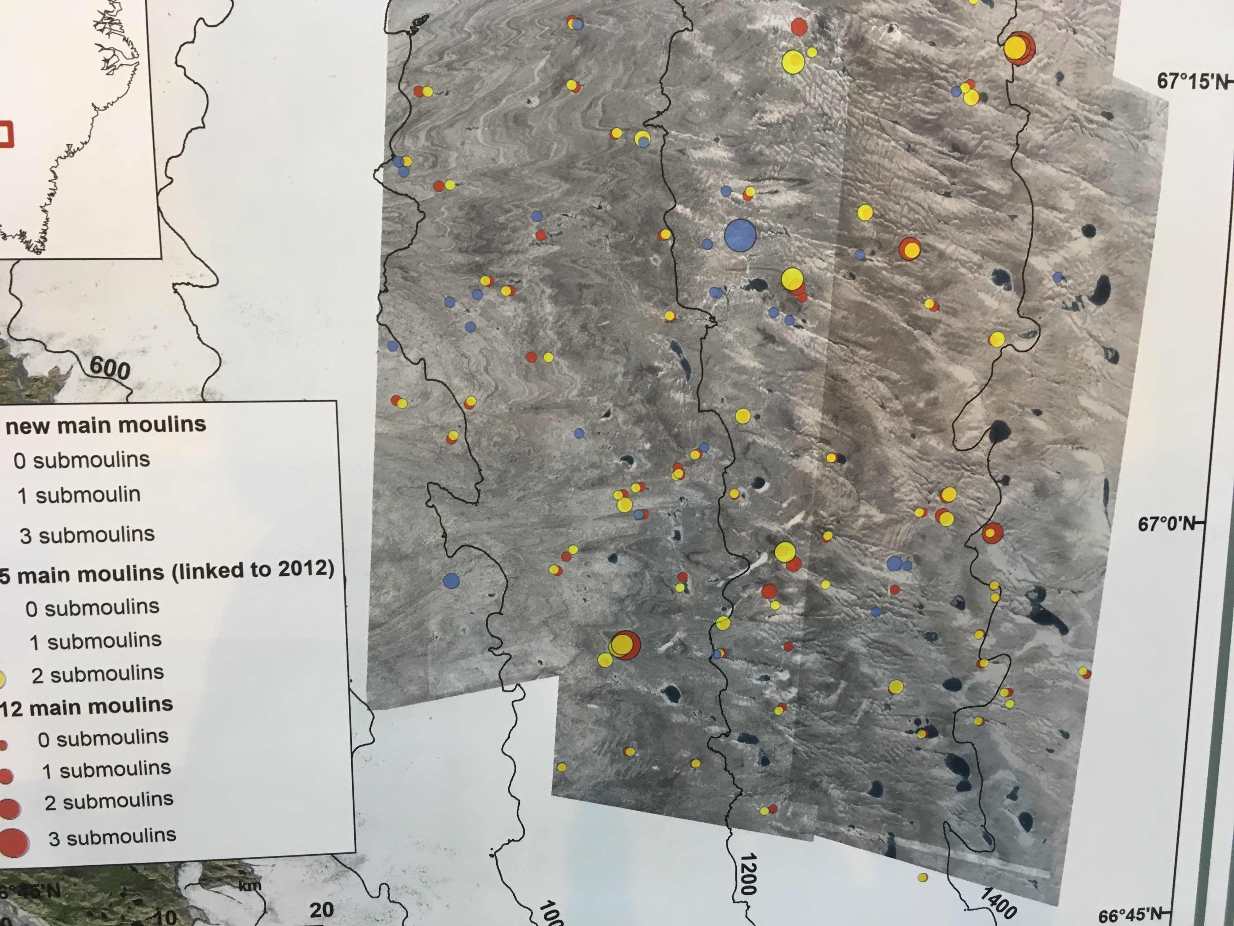 Vena Chu at UC-Santa Barbara’s team mapped river networks On Russell Glacier that terminate into moulins which connect surface melt to englacial and subglacial drainage networks. They used WorldView imagery to show development of molins and their migration between 2012 and 2015. The majority of moulins they mapped in 2015 were moulins in 2012. New moulins most commonly formed in crevassed, thinner ice areas near the ice margin, and a lesser but significant quantity at higher elevations above 1300 m.