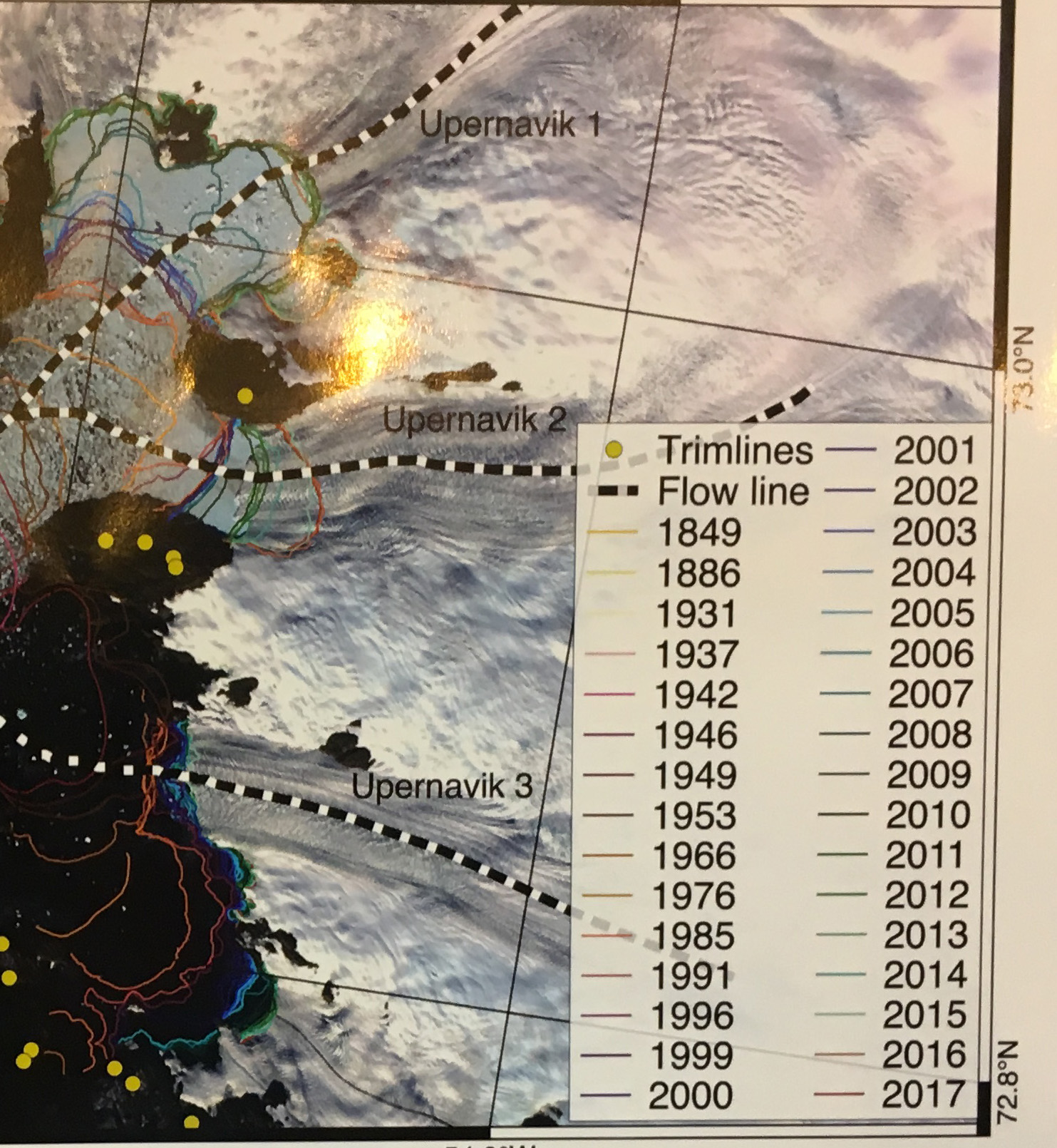 Konstanz Haubner, with a team from GEUS in Denmark provided a model simulating velocity and ice thickness change at Upernavik Glacier, Greenland from 1849-2017. In the image above the retreat is illustrated, separating into three separate glaciers with a more bedrock pinning points to stabilize. They noted a changing contribution to Upernavik’s ice mass loss from surface melt and ice dynamics in different time periods.
