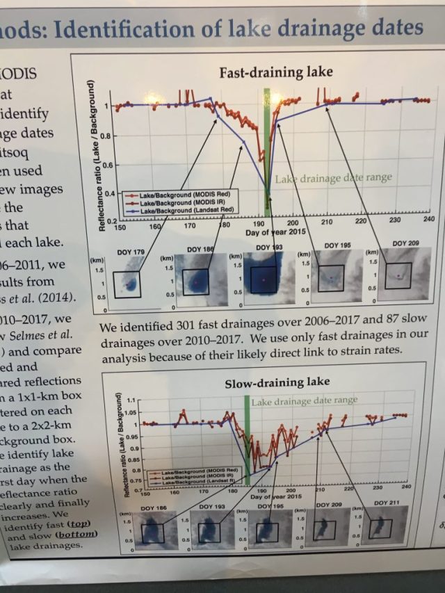 Kristin Poinar, NASA GSFC team examined the drainage of supraglacial lakes in Greenland. They investigated factors that control when and where the lakes drain to the ice sheet base. They observed 359 lake drainage events in a west Greenland region and compare the dates of these drainage events to strain rates calculated from satellite data. They noted both slow draining and fast draining lakes, the faster drainages occurring later in the summer on average. They found that strain rates did not satisfactorily predict lake drainage date.