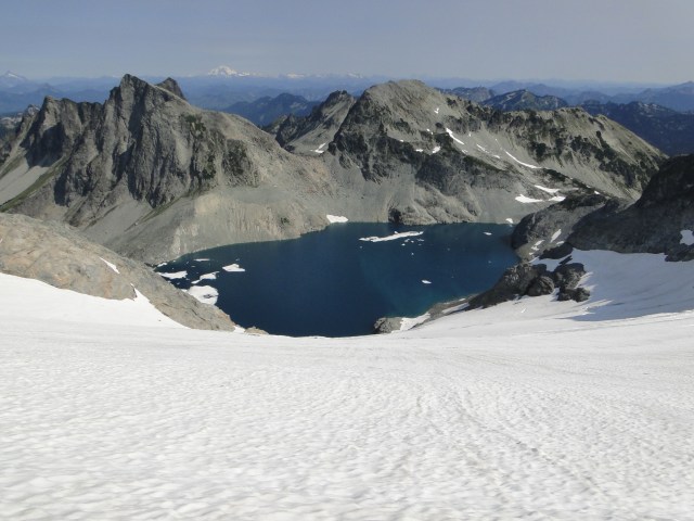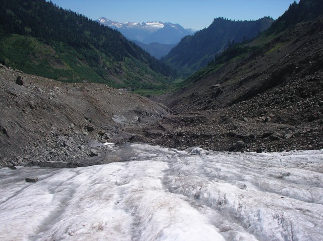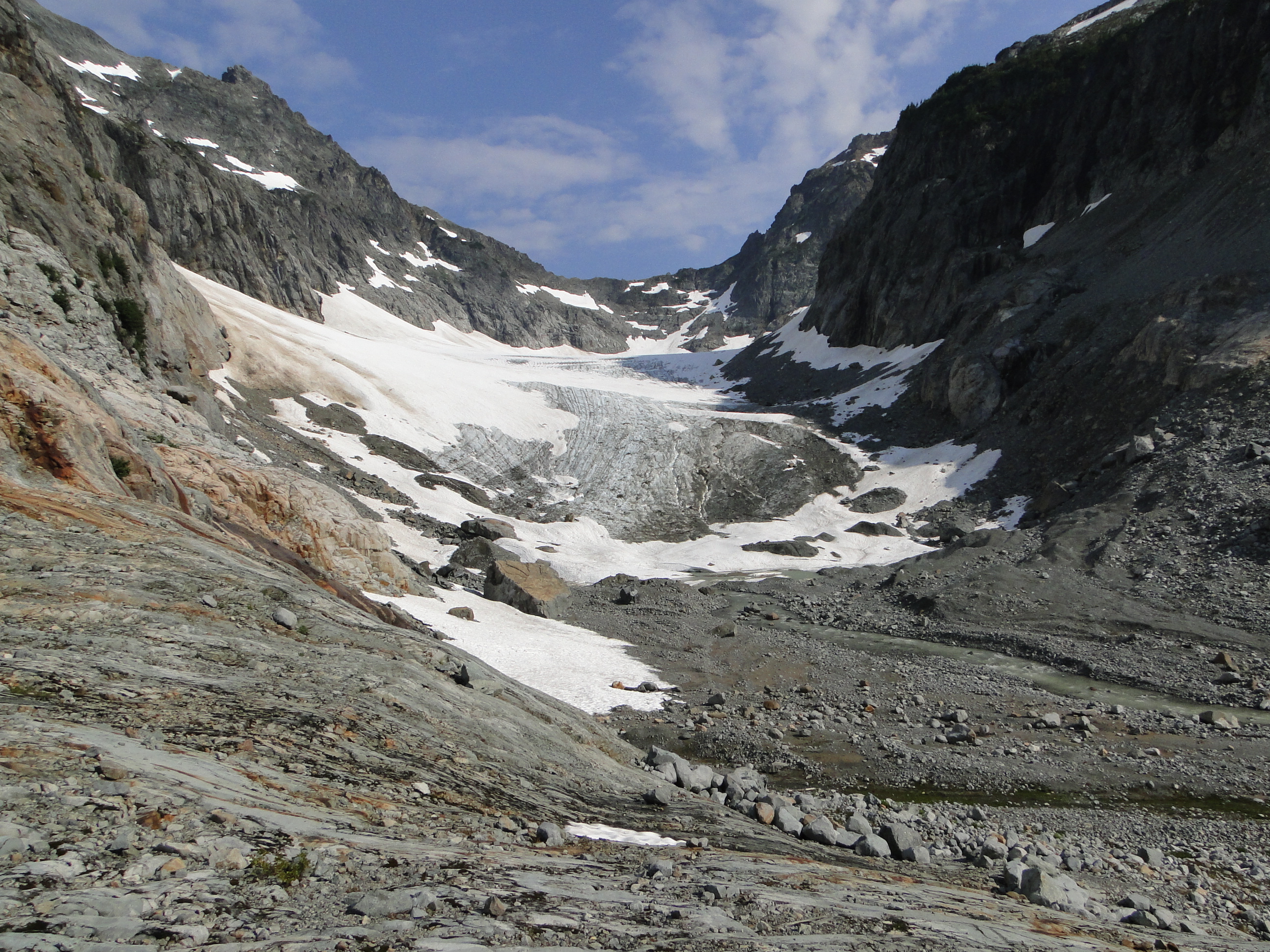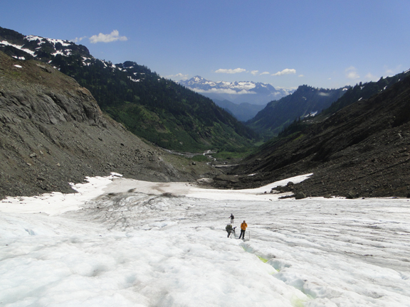 We spent a week observing ablation and resulting glacier runoff on Sholes Glacier. With Oliver Grah and Jezra Beaulieu who work for the water resources section of the Nooksack Indian Tribe we emplaced a stream gage right below Sholes Glacier and one on Bagley Creek which is snowmelt dominated. With the water level gages in we all began work on a rating curve for the Sholes Glacier site directly measuring discharge on 14 occasions, kayak socks helped reduce the impact of cold water. Average ablation during the week was 8.25 cm/day of snowpack or 5 cm of water, discharge measurements identified a mean of 5.2 cm/day of from the glacier during this period. The agreement between ablation and discharge was a nice result. Discharge became notably more turbid after 1 pm, peaking in turbidity around 5 pm. Of equal interest was the change in snowcovered area. On July 19th a Landsat image indicated 100% snowcover for Sholes Glacier. On Aug. 4th our surface measurements indicates a blue ice area of 12,500 square meters, which is also evident in a Landsat image from that day. By Aug. 20th a satellite image indicates that the blue ice area had expanded to an area of square meters. This coincided with the area where snowdepth was observed to be less than 1.2 m on Aug.4. This represents a volume loss of 592,000 cubic meters of water in 16 days.