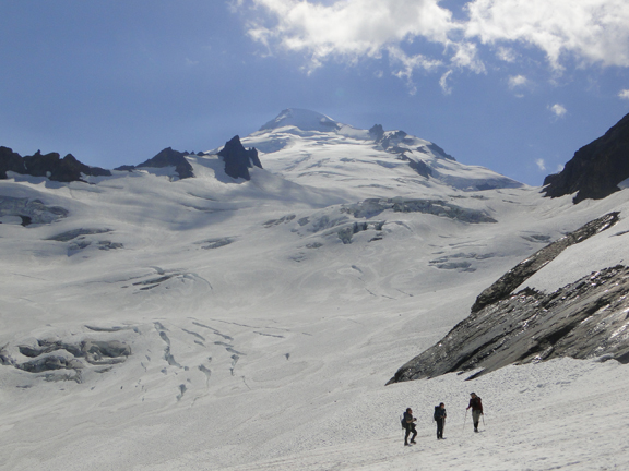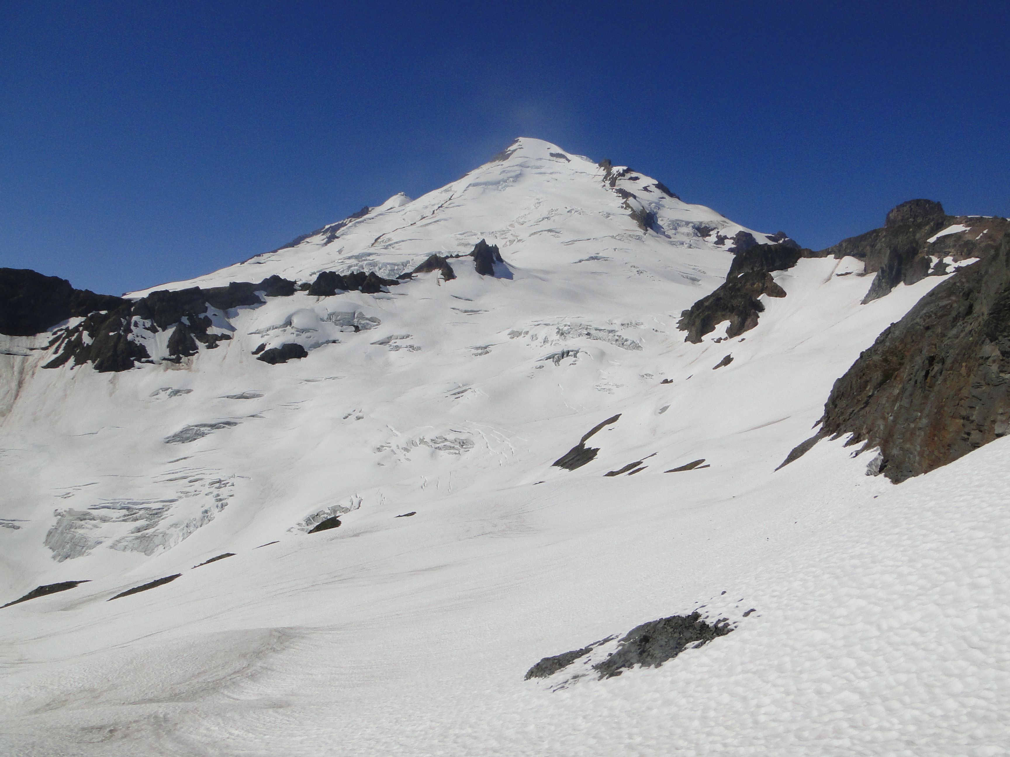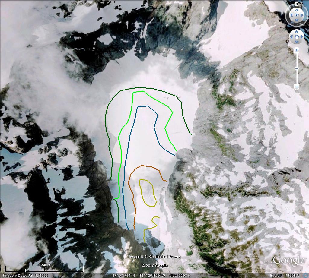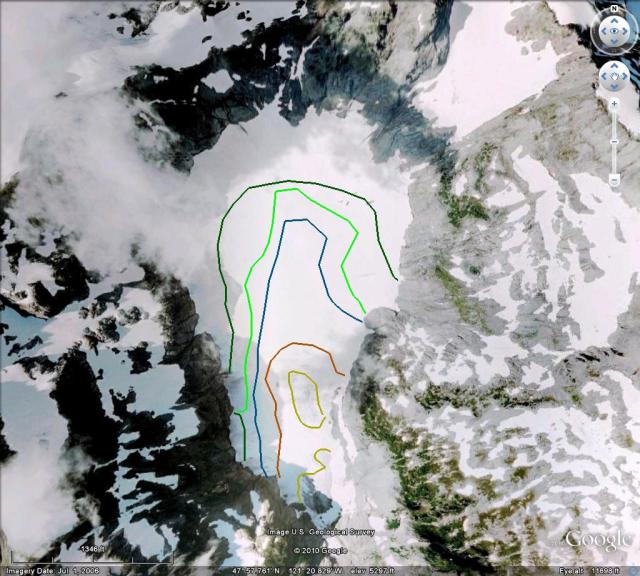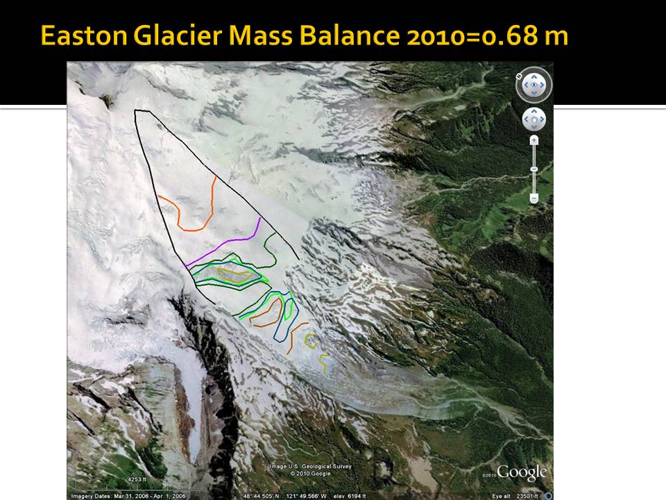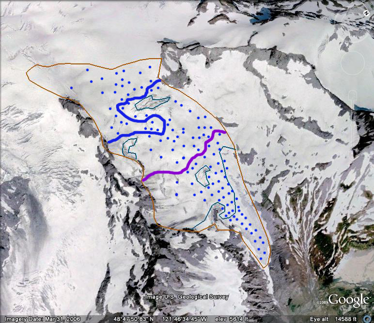 Easton Glacier extends from the terminus at 5600 feet to the slopes near Sherman Crater at 9000 feet. Each summer since 1990 NCGCP has measured the mass balance of this glacier. View