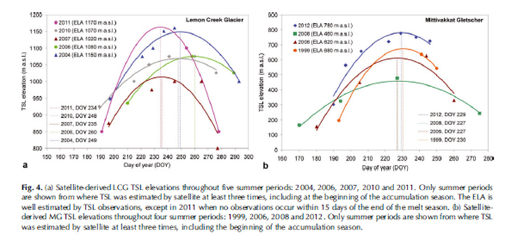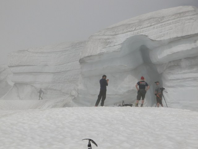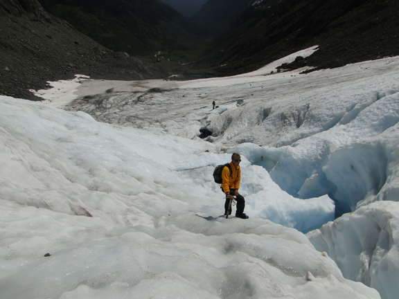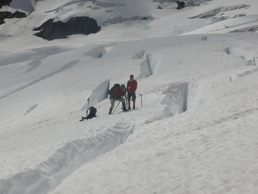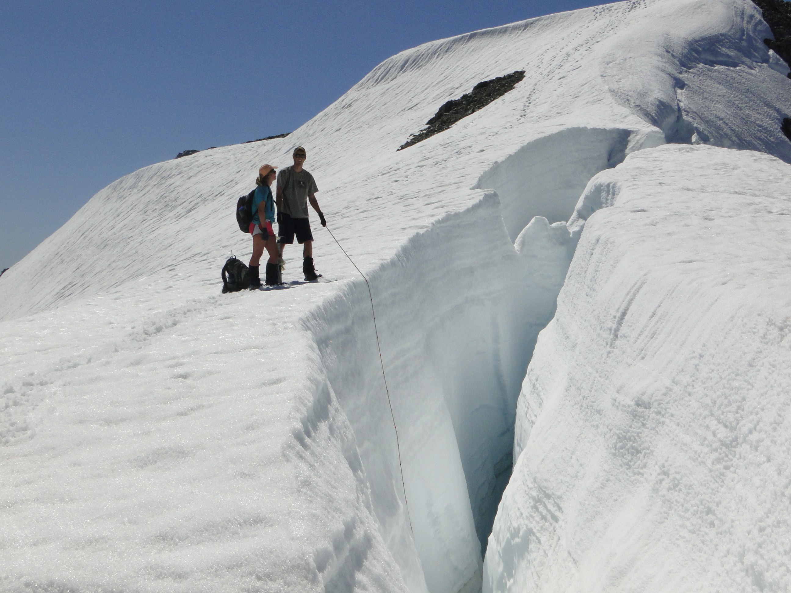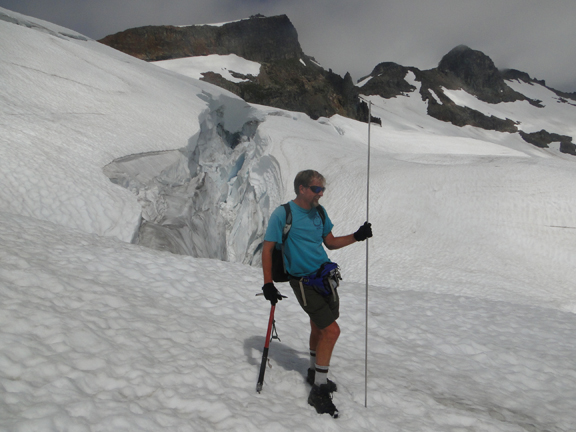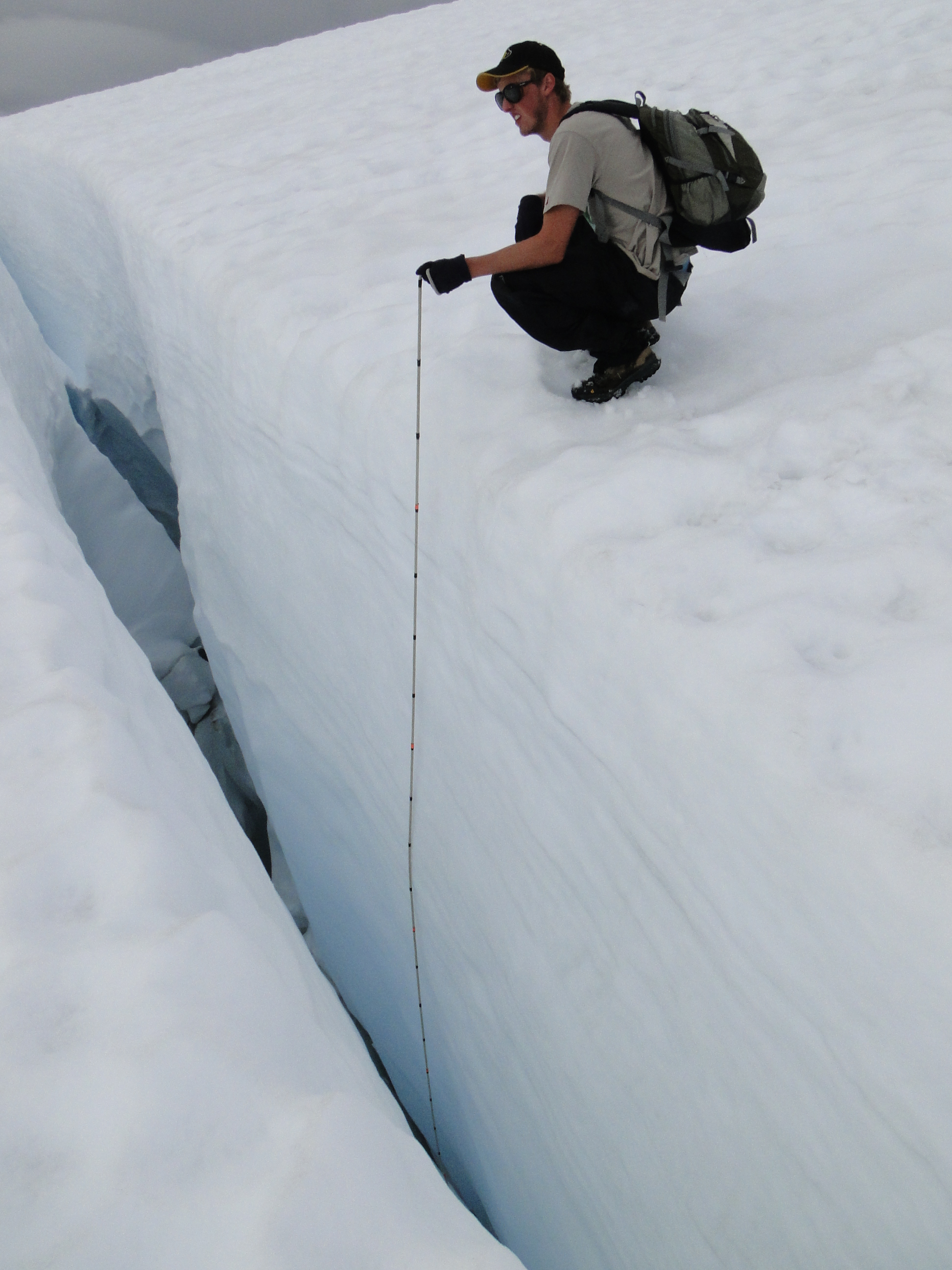 We measured the mass balance on Rainbow and Sholes Glacier during this period. The snowpack was poor on both, especially above 1900 meters on Rainbow Glacier. Typical depths are over 5-6 m, this year 3.75-4.5 m. The poor snow depths were also noted on the Easton Glacier above 2000 m in crevasse stratigraphy measurements. Each crevasse is approached probing to ensure it is safe and then assessed to make sure the crevasse is vertically walled, this enables a safe but also accurate measure. In some cases layers from mulitple years can be assessed. IN the Lynch Glacier crevasse the 2013 layer will be lost to melt before end of the summer.