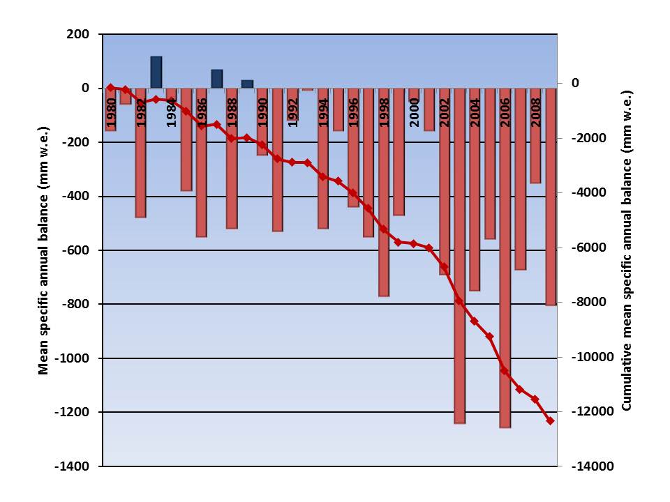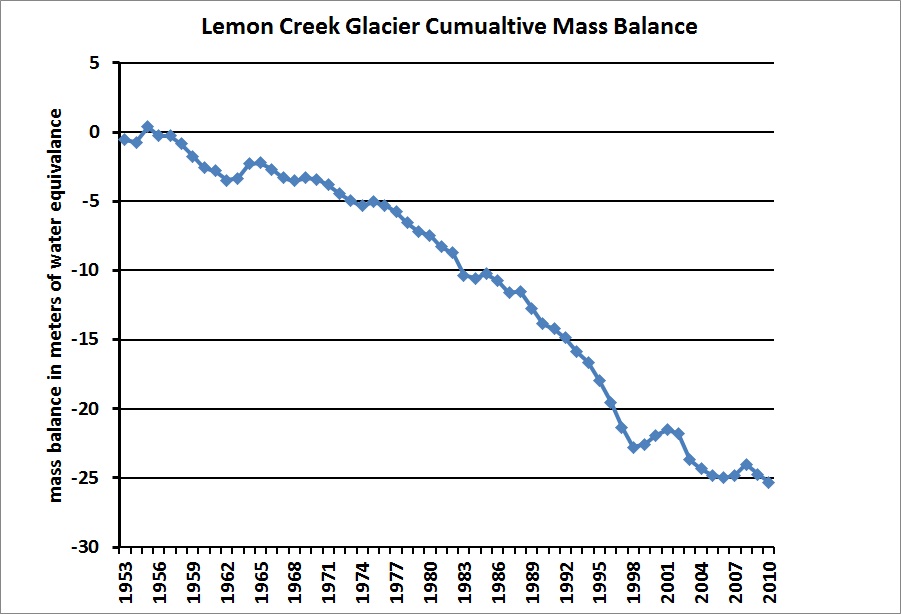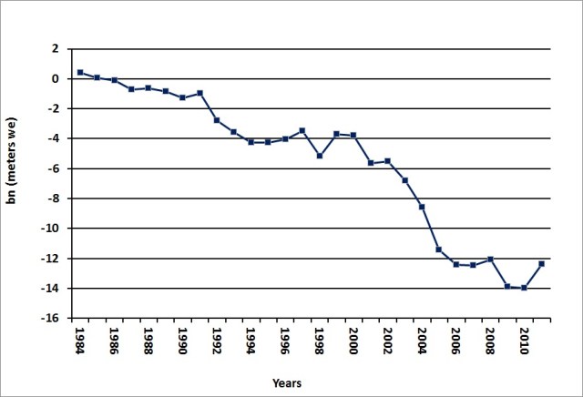 Despite the advantages of snow accumulation the glaciers mass balance since 1984 has average -0.5 m a year for a cumulative loss of 13 m. For a glacier that averages 60 m in thickness this is over 20% of its volume. Details of the