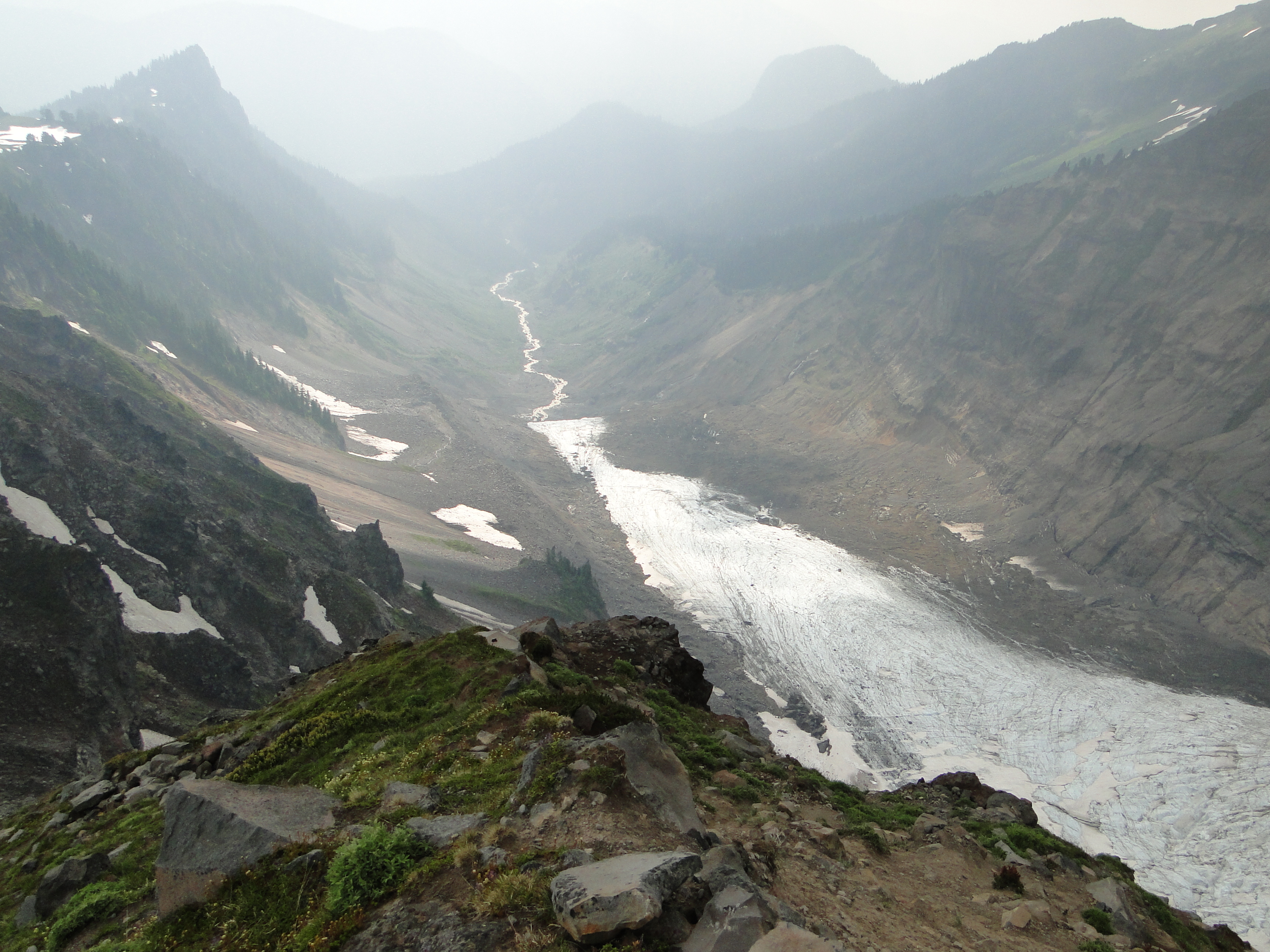 The 2013 winter season provided close to average snowpack in the North Cascades as indicated by the average SWE at SNOtel stations in the range. The summer melt season has proved to be long, warm and dry. The May-August mean temperature at the station closest to a glacier, Lyman Lake, has been tied for the 2nd warmest in the last 25 years with 2009 and only 2004 warmer. The summer has lacked record periods of warmth and has featured sustained warm temperatures and higher than average humidity, reducing the number of nights when the glacier surface has frozen. The average minimum temperatures at Lyman Lake are the highest in the last 25 years for July and August. The humidity was the strikingly high during our field season, note diagram from a Cliff Mass article on the topic. The net result will be significant negative glacier mass balances in the North Cascades. There is one month left in the melt season most glaciers are close to an equilibrium balance already.