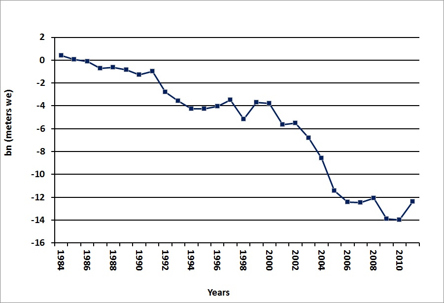 In this case the mass balance record indicates a dramatic worsening after 1995. It will be interesting to see the ablation results from the summer of 2008, when record melting was noted both in northern Greenland and northern Ellesmere Island. The glacier is not alone in its behavior, the Prince of Wales Icefield has had a negative mass balance over the last forty years of -80 km3, equivalent to a mean-specific mass balance across the ice field of -0.1 m w.e. a-1, contributes 0.20 mm to global eustatic sea level rise (