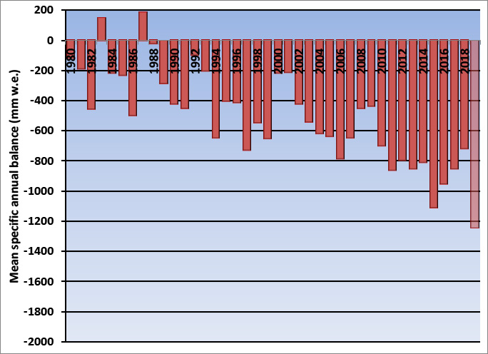 Today this data reporting system is managed by the World Glacier Monitoring Service (WGMS). WGMS annually collects standardized observations on changes in mass, volume, area and length of glaciers with time, and additionally collecting statistical information on the distribution of glaciers from inventories. WGMS just published their third Global Glacier Change Bulletin, a comprehensive data report covering the 2015/2016 and 2016/2017 hydrologic years. I review some of that information here with updated reference glacier mass balance data from WGMS for 2018 and 2019.