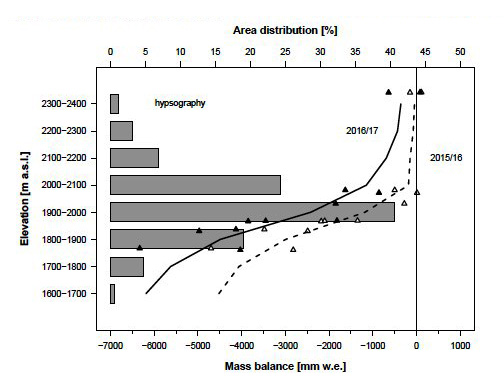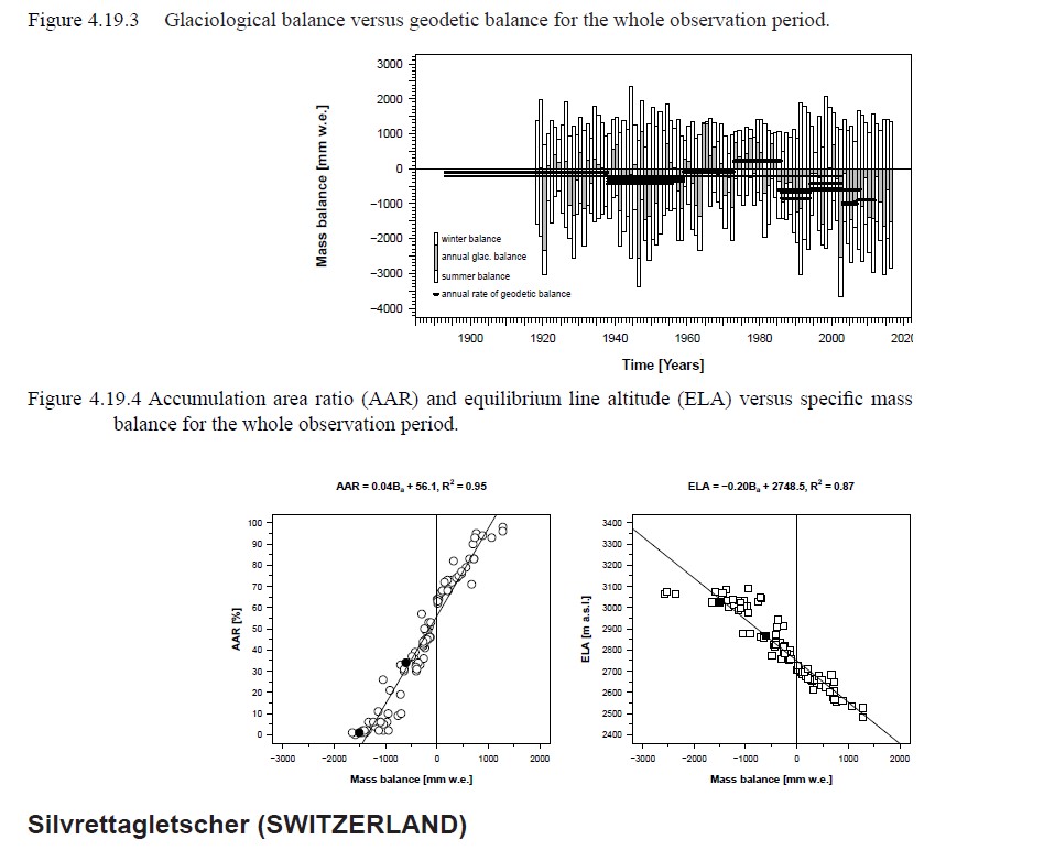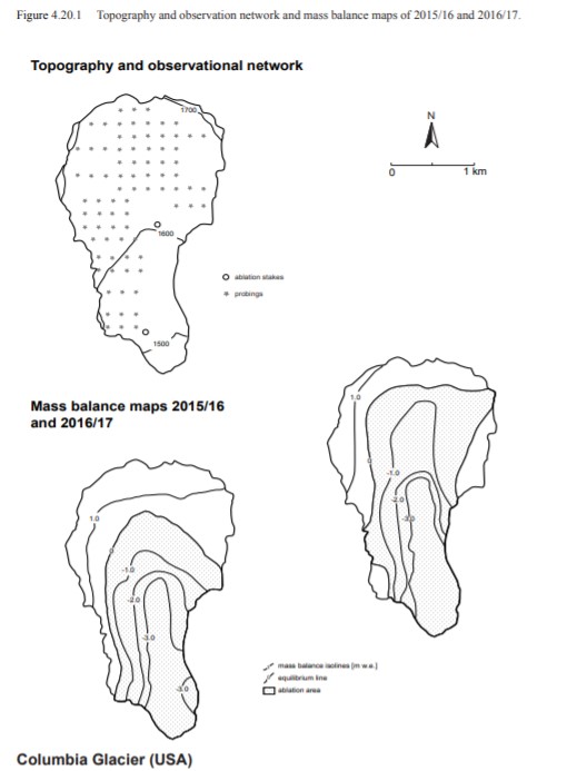 Detailed information is reported for 20 glaciers distributed around the globe that includes annual mass balance maps as illustrated from Columbia Glacier. The relationship between elevatation and annual balance is the balance gradient seen below for Mocho Glacier, Chile. This glacier is in the lake district of Chile at 39.90° S and 72.00° W and did not have significant accumulation in 2016 or 2017. The AAR-annual balance relationship and the ELA-annual balance relationship and annual balance record are reported, as exemplied by Silvretta Glacier, Switzerland, where negative balances occurred in 2016 and 2017.